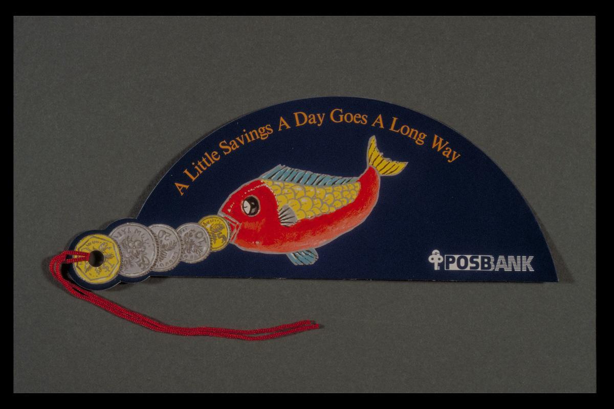 Fish-design bookmark with slogan, ‘A little savings a day goes a long way’’