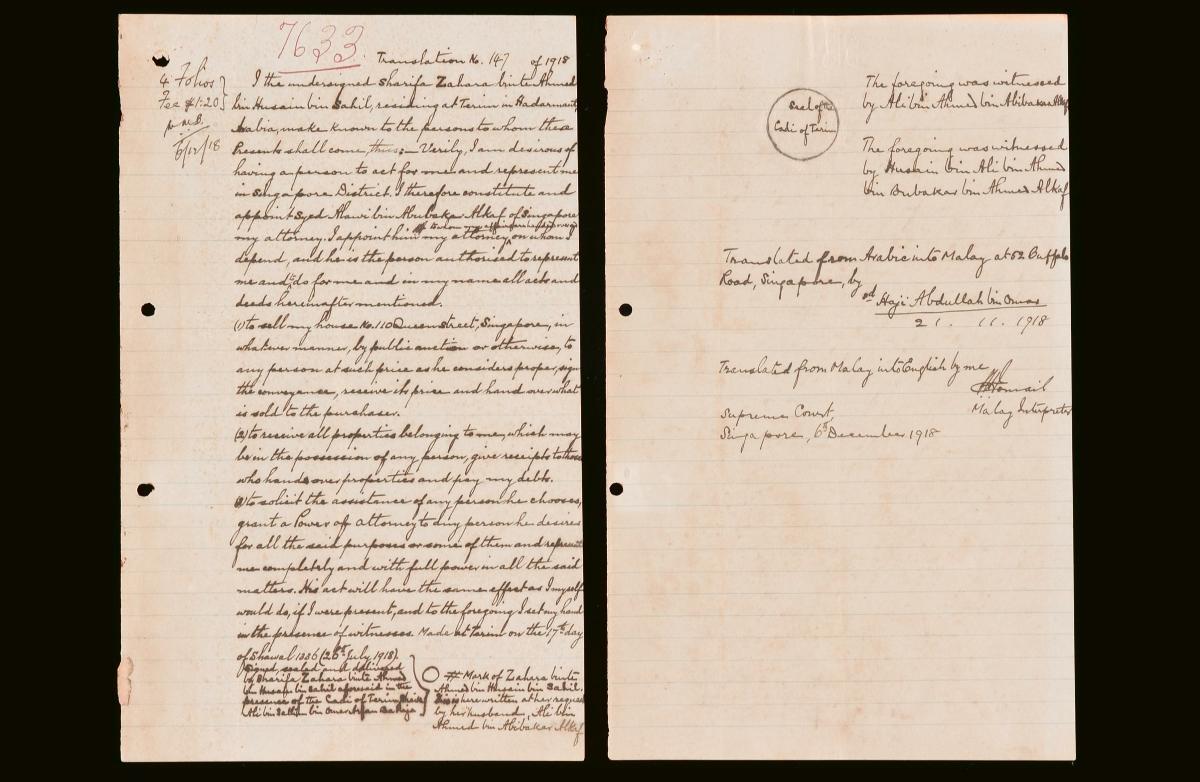 This is a Malay translation of the power of attorney issued by Sharifa Zahara binte Ahmed bin Hussain bin Sahal of Terim in Hadhramaut, Arabia. It was granted to Syed Alawi bin Abubakar Alkaf of Singapore, who would manage her property and assets in Singapore, including the right to sell her property at 110 Queen Street. The power of attorney was sealed by the Kadi of Terim, Shaik Ali bin Sallim bin Omar Arfan Ba Raja. It was translated from Arabic to the Malay language by Haji Abdullah bin Omar of No. 52 Buffalo Road, Singapore on 21 November 1918.This document is part of the John Koh collection which comprises of various legal documents in Arabic, Jawi, and English, and serves as a record of the 19th and early 20th century colonial legal systems in Singapore and the interactions of various ordinary individuals with the law.