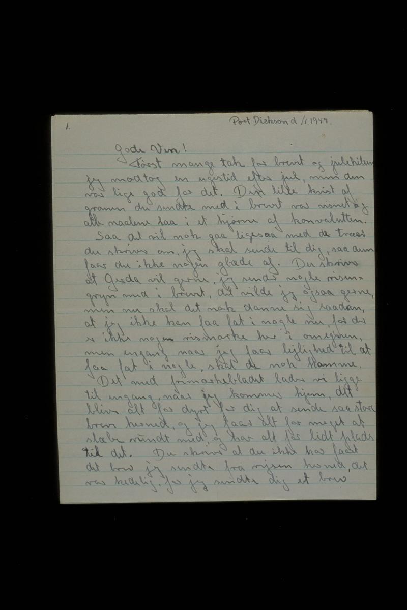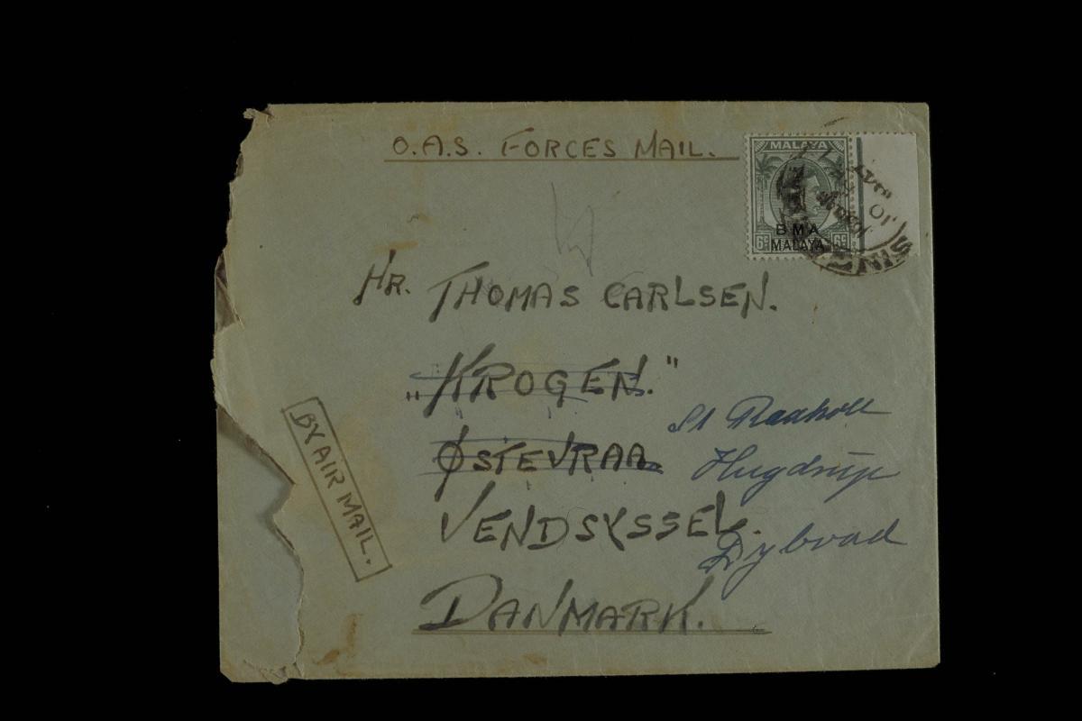 A hand-written letter from Private Knud Rasmussen of the Northamptonshire Regiment, 1st Battalion, D Company of the Southeast Asia Command (SEAC), to Mr. Thomas Carlsen in Denmark. It contains Rasmussen’s photograph and a booklet dated July 1947 entitled ‘Greetings from Singapore’.