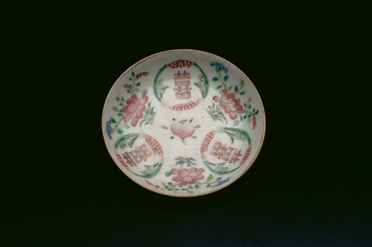 This gilt-foliated sauce dish is part of a Nonyaware dinner service. It is bordered in pink with polychrome motifs of flowers in four seasons or are these Buddhist emblems? The interior of the dish has motifs of phoenix and peony in pink, green, blue, brown and iron-red.The collective Baba Malay term for dining ware is 'pinggan mangkok', which literally means 'plates and bowls'. The dinner service can also include cups, saucers, spoons and spoon rests. Wealthy Peranakan families often commissioned the highest quality porcelain wares for special occasions that would bear their surnames. These wares would have elaborate decorations of phoenix and peony motifs, and colourful backgrounds like this example.
