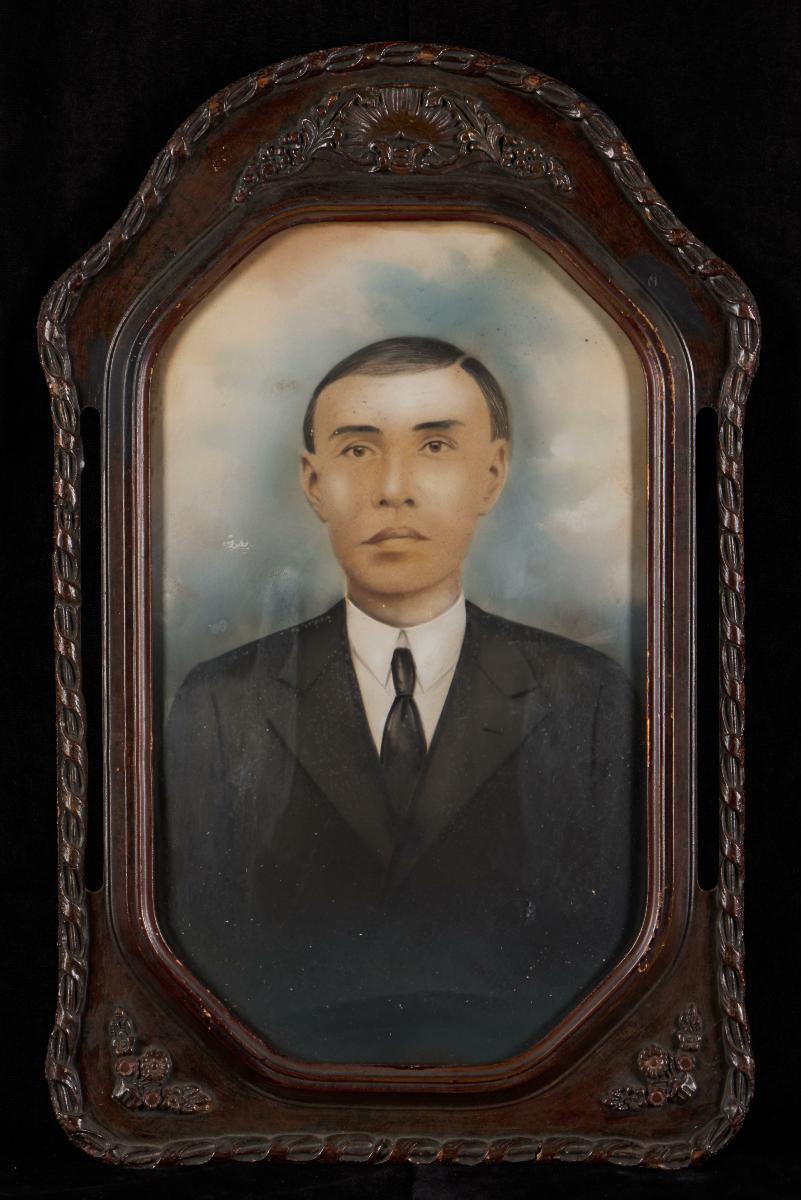 This pair of portraits is of a Peranakan couple from Indonesia mounted in their original frames. The man is wearing a black shirt, with a Chinese collar and gold buttons. The woman is wearing a kebaya, a traditional Peranakan Chinese outfit, with a set of kerosang (brooches) fastened in place. Her hair is pulled back in a sanggul (hair bun).Such portraits were usually hung in the halls of traditional Peranakan homes to commemorate revered ancestors.
