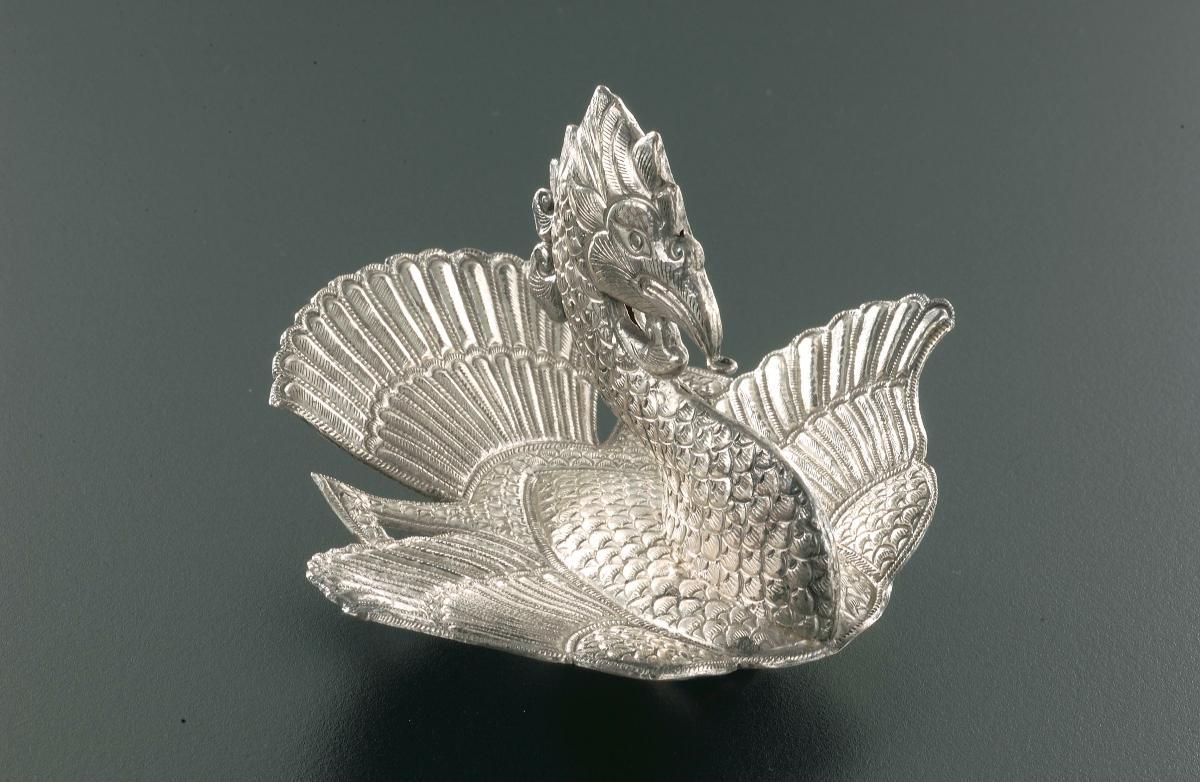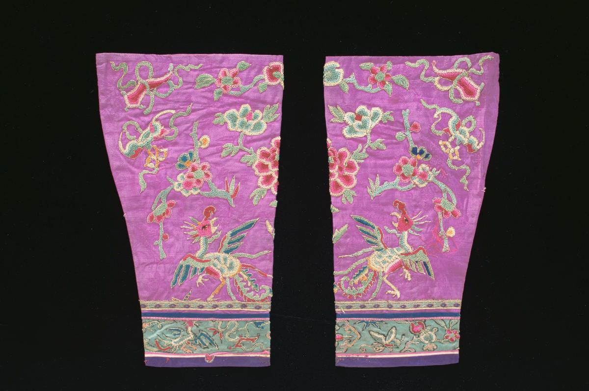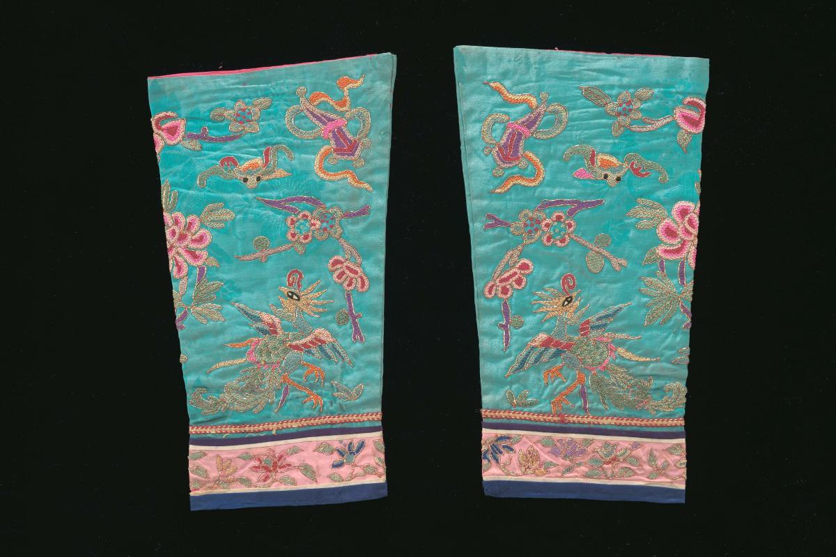 These embroidered forearm attachments were slipped over the garment when offering prayers and paying respects to elders. The sleeves would cover the folded arms so that a continuous band of colour was formed.Wedding couples in Singapore and Malacca were usually flanked by a page boy and page girl as seen here, while a wedding couple from Penang would usually have a pair of page boy and page girl. There were also regional differences in the style of wedding garments, jewellery and headdress used by the bridal couple.