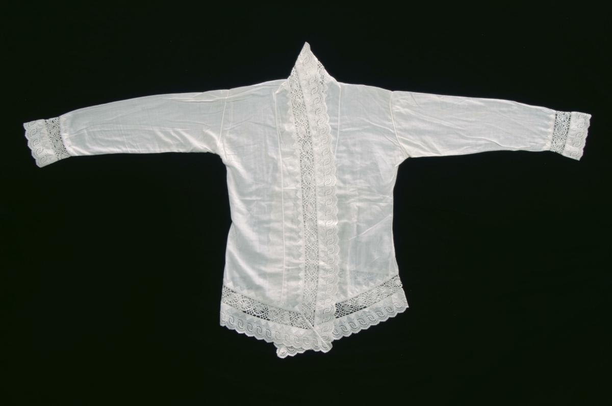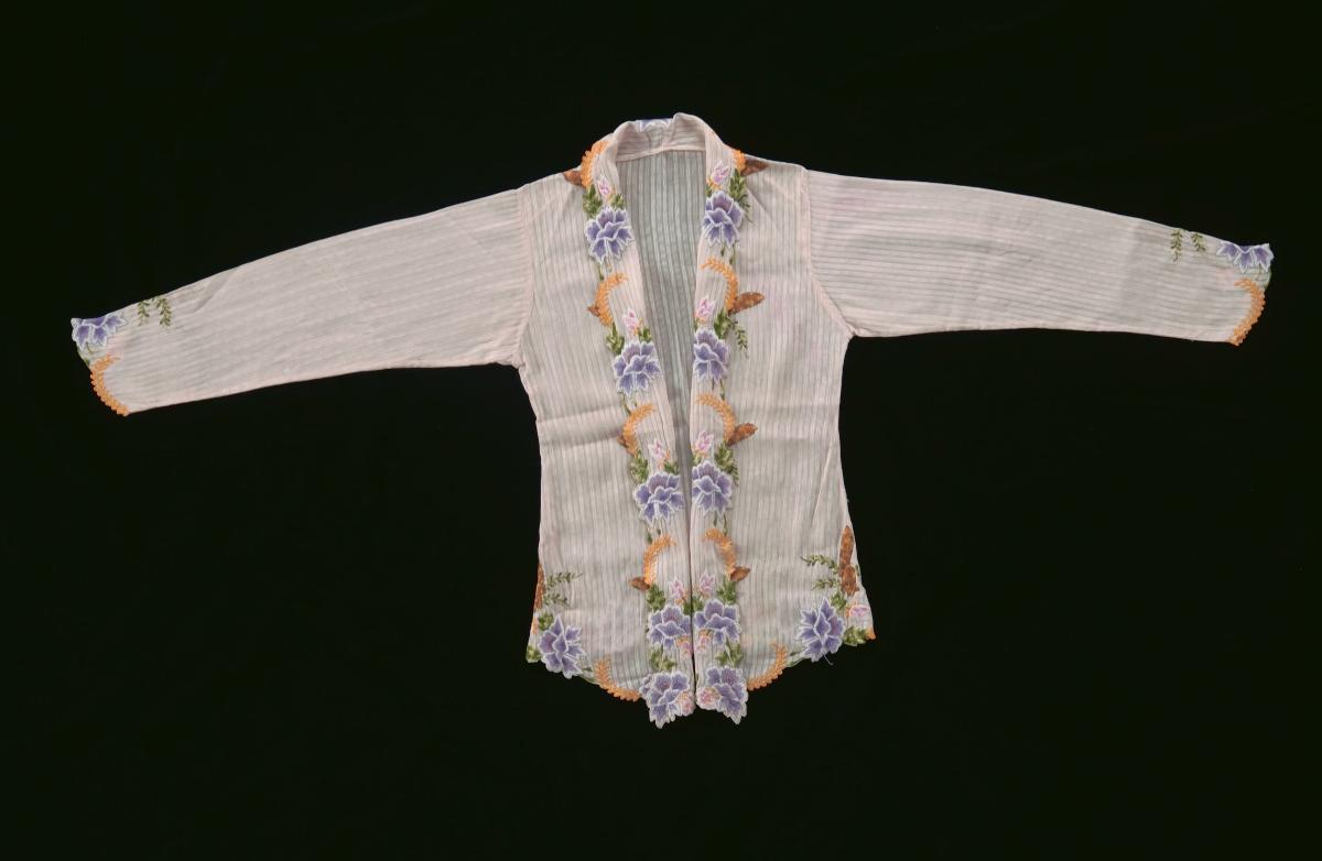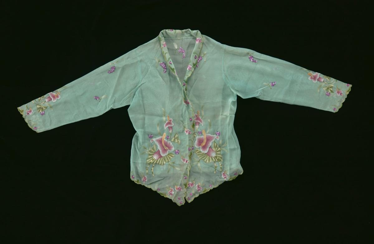 This kebaya is decorated with embroidered butterfly motif with leaf and flower motifs along the frontal hems and on the fringe of the sleeves.The Peranakan Chinese kebaya is a long sleeved, open blouse reaching to about waist-length. It is usually decorated with embroidery and lace on the frontal and outer hems, as well as the fringes of the sleeves. The garment has a v-shaped neckline and an open front, which is secured by three ‘kerosangs’ or brooches. A kebaya could be made from rubia or voile, which is a type of fine cotton fabric originating from France or Switzerland. Peranakans generally wore kebayas with geometric or floral designs in the 20th century and coloured kebayas became fashionable during this time. The kebaya came into prominence in the early 20th century, when it slowly replaced the knee length ‘baju panjang’ robe. It is worn with an inner camisole and paired with the sarong, which is a rectangular piece of dyed cotton cloth worn as a skirt by wrapping it around the waist. These garments became a distinct part of the identity of Peranakan women.