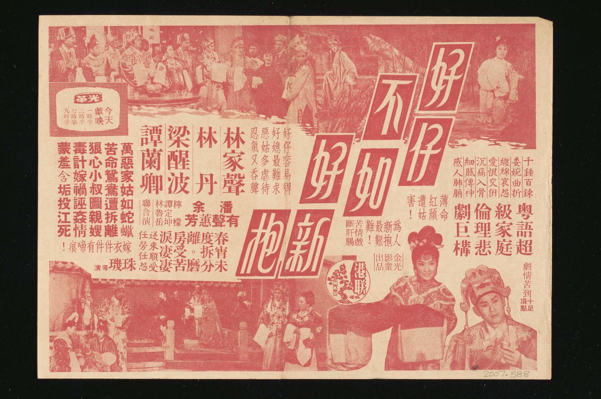 This handbill was used to advertise the Cantonese movie, ‘The Hypocritical Heart’ (两重心, Liangchongxin), also known as ‘A Myriad Home’. During its Singapore run, the movie was screened at the Jubilee (光华, Guanghua) and Xinchongqing (新重庆) cinemas.Between the 1950s and 1960s, most Mandarin, Cantonese and other Chinese-dialect movies were made in Hong Kong by film production companies with financial support from Singapore-based film studios such as Shaw Brothers, Cathay and Kong Ngee (光艺, Guanyi). These studios were also involved in the distribution and exhibition of these movies in Singapore and the rest of Southeast Asia through their network of cinemas. In the early 1970s, Mandarin movies from Taiwan became popular, but by the late 1970s, Hong Kong movies were dominant once more.