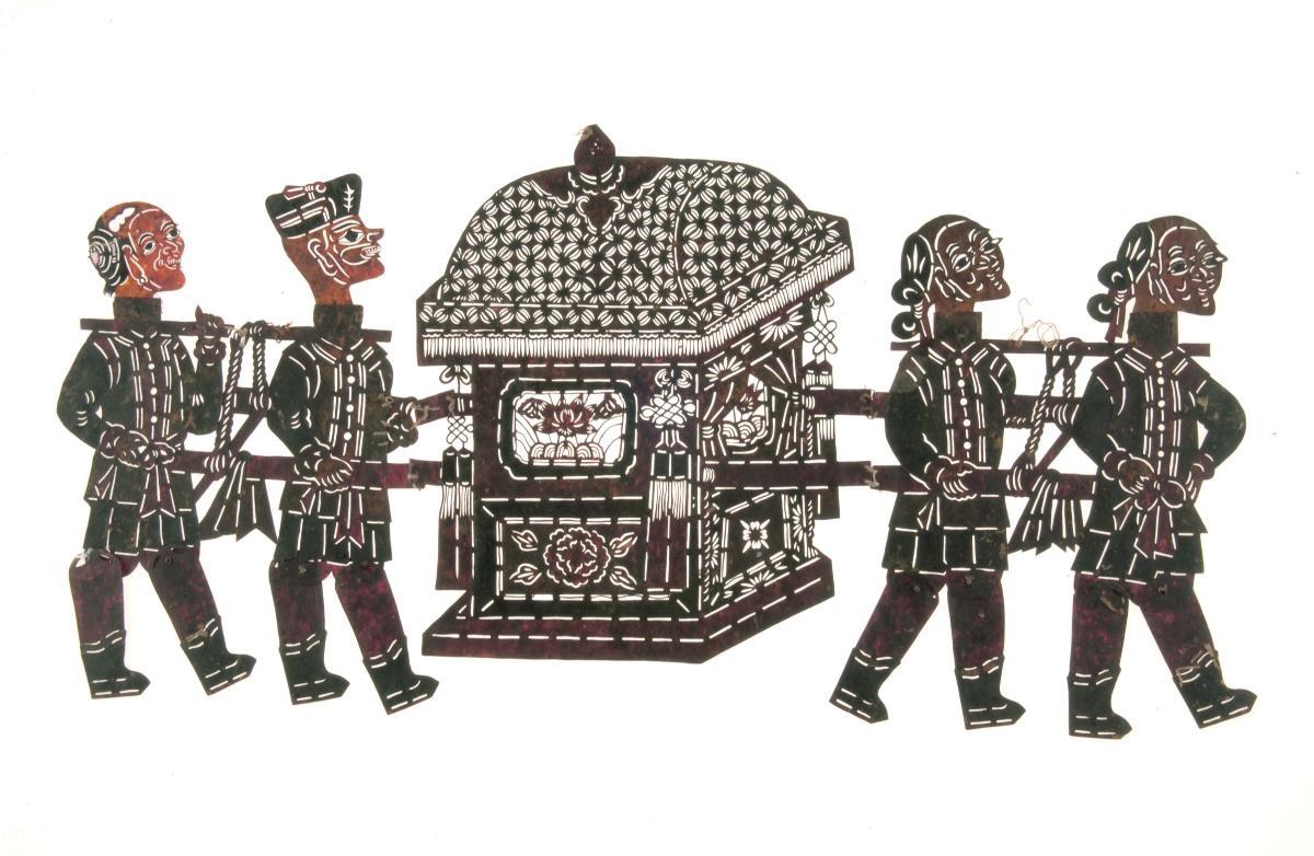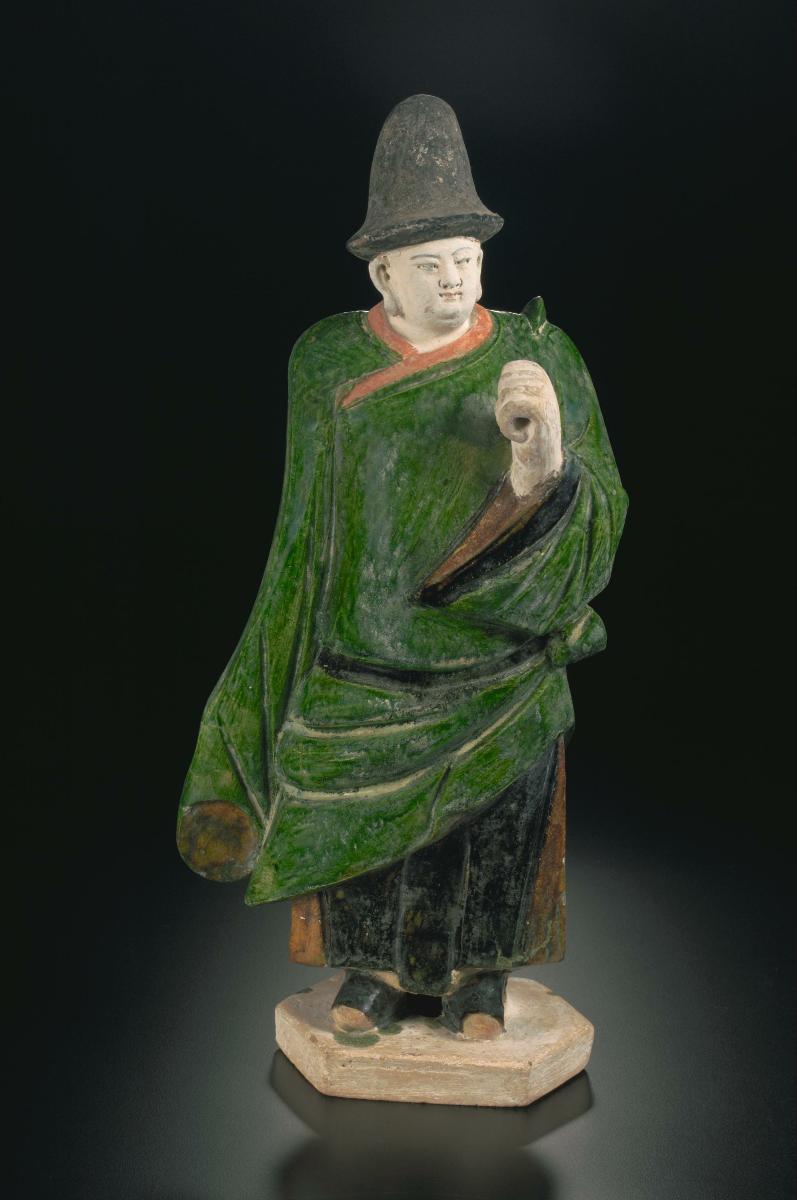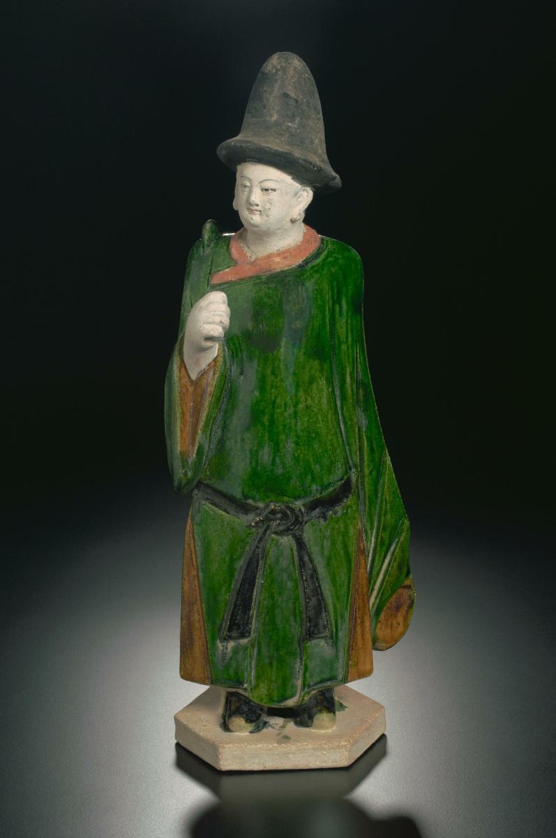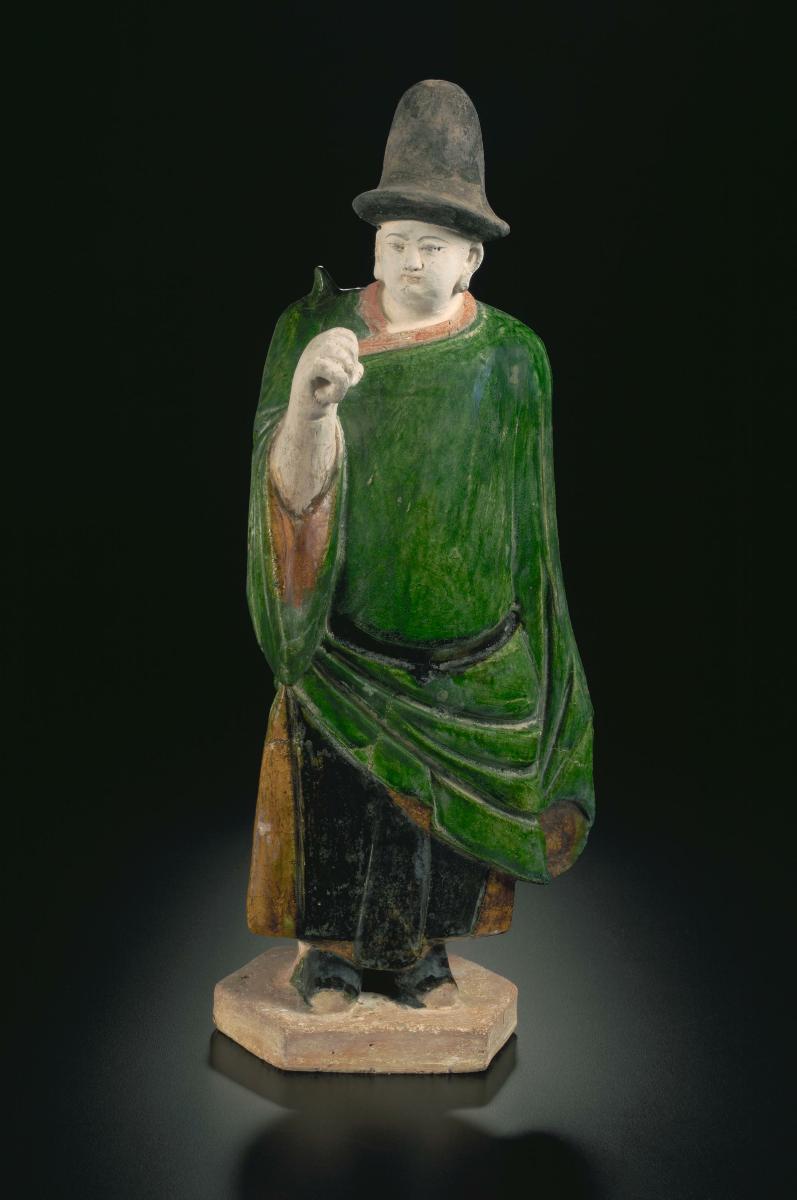 This processional figure of a sedan chair carrier is decorated with colourful pigments and a shiny green lead glaze. His right hand is concealed beneath the sleeves while his left appears as if carrying the pole attached to the sedan chair.The figurine is 'mingqi' or burial ware that would have been part of a larger group of funerary items. The custom was an ancient one. It is thought these wares were necessary for the deceased in the next world. Elaborate groups of burial wares were also a display of wealth and social status.The practice of using lead-glazed burial wares had already started during the Han dynasty (206 BCE-220 CE). This glaze technology further developed during the Tang dynasty (618-906) into ‘sancai’ (‘three-colour’) glaze. It included colours such as cream, amber, brown and blue. The glaze tradition continued into the Ming period.