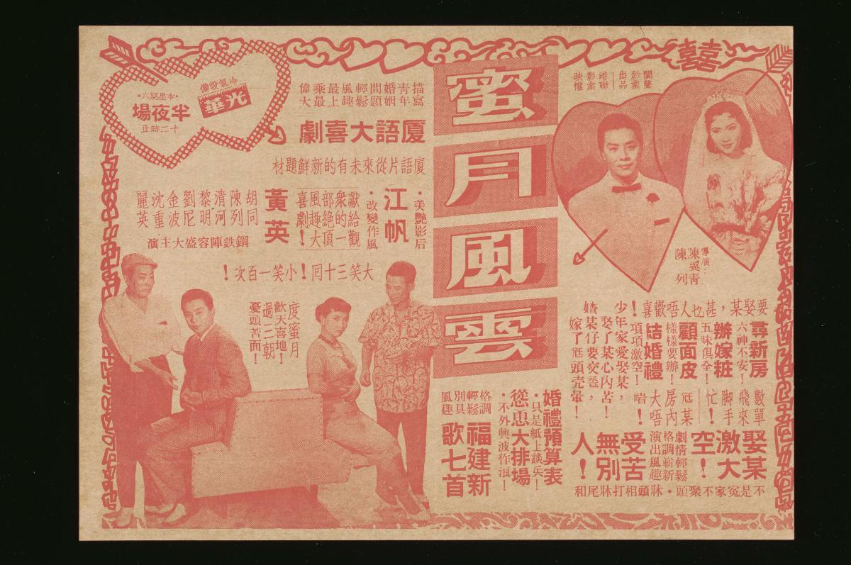 This handbill was used to advertise the Cantonese movie, ‘Hotel Lavender’ (蓝色酒店, Lansejiudian), also known as Hotel Blues. During its Singapore run, the movie was screened at the Ruby (宝石, Baoshi) cinema.Between the 1950s and 1960s, most Mandarin, Cantonese and other Chinese-dialect movies were made in Hong Kong by film production companies with financial support from Singapore-based film studios such as Shaw Brothers, Cathay and Kong Ngee (光艺, Guanyi). These studios were also involved in the distribution and exhibition of these movies in Singapore and the rest of Southeast Asia through their network of cinemas. In the early 1970s, Mandarin movies from Taiwan became popular, but by the late 1970s, Hong Kong movies were dominant once more.