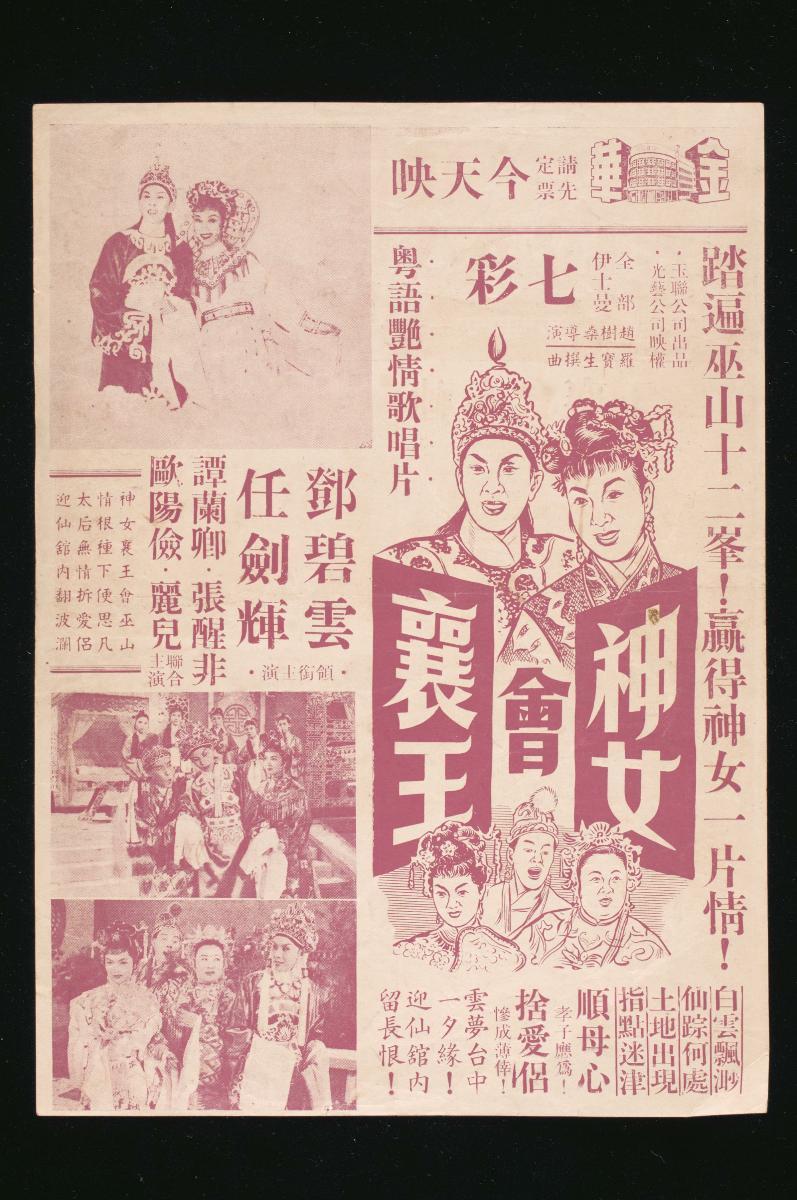 This handbill was used to advertise the Cantonese movie, ‘Goddess of the Sea’ (天后娘娘, Tianhouniangniang), also known as ‘The Goddess of Heaven’, which was based on a Chinese opera. During its Singapore run, the movie was screened at the Jubilee (光华, Guanghua) cinema.Between the 1950s and 1960s, most Mandarin, Cantonese and other Chinese-dialect movies were made in Hong Kong by film production companies with financial support from Singapore-based film studios such as Shaw Brothers, Cathay and Kong Ngee (光艺, Guanyi). These studios were also involved in the distribution and exhibition of these movies in Singapore and the rest of Southeast Asia through their network of cinemas. In the early 1970s, Mandarin movies from Taiwan became popular, but by the late 1970s, Hong Kong movies were dominant once more.