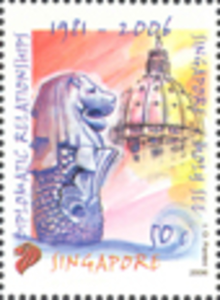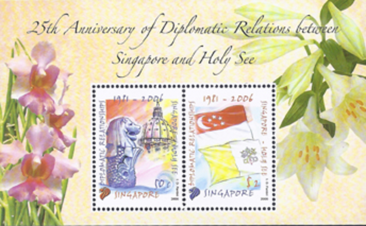 This is one of the two stamps issued as a set on 12 October 2006 to commemorate 25 years of diplomatic relations between Singapore and Holy See. The stamps were designed by Irio O. Fantini. This 50-cent stamp features the Merlion and St. Peter’s Basilica.