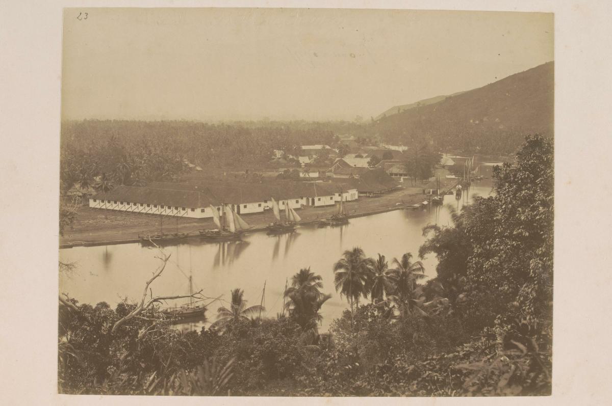 This is a glass stereoscopic slide from the H. Schaefer Collection showing a view of the Chao Phraya River from a hotel in Bangkok.