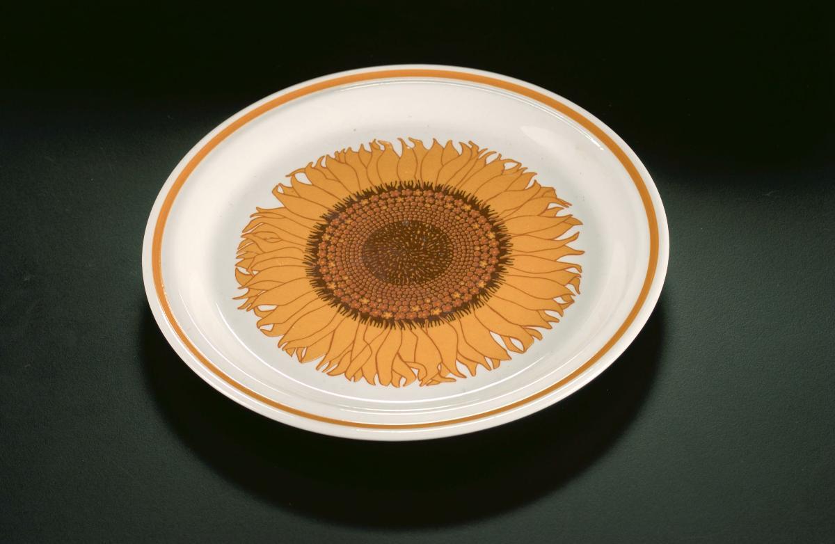 This is a plastic plate from a breakfast set with a sunflower design theme inspired by the hippie aesthetics of the 1970s.
