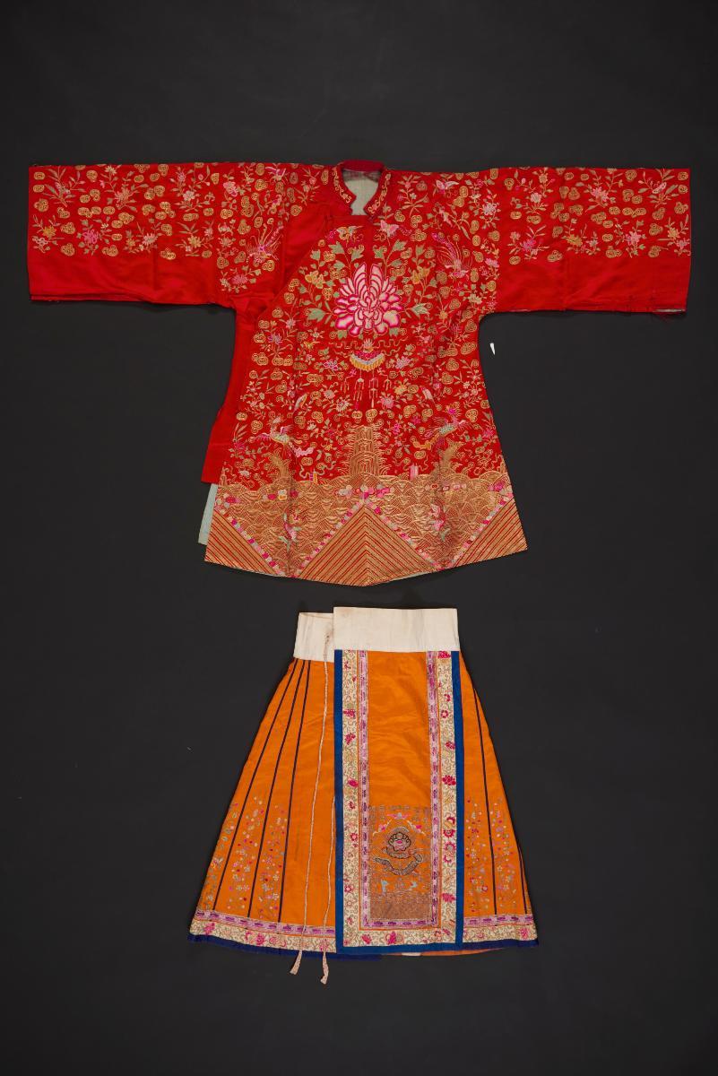 This garment is part of a two-piece skirt that is worn by Peranakan brides. The skirt is embroidered with floral and bird motifs. Such auspicious motifs are recurrent motifs found on Peranakan wedding garments. Bridal wedding garments of a style like this were predominantly used by the Peranakans of Malacca and Singapore from the late 19th century to the early 20th century. In Penang however, the wedding garments differ slightly in colour and choice of motifs. There is a larger range of motifs employed, such as the peacock, rabbit, pheasant, ‘qilin’ (a mythical Chinese hoofed creature), chrysanthemum and lotus. Some Peranakan wedding garments from Penang are trimmed with rabbit fur, indicating that it was meant for a wedding that took place in the ‘winter’ months at the end of the lunar year.