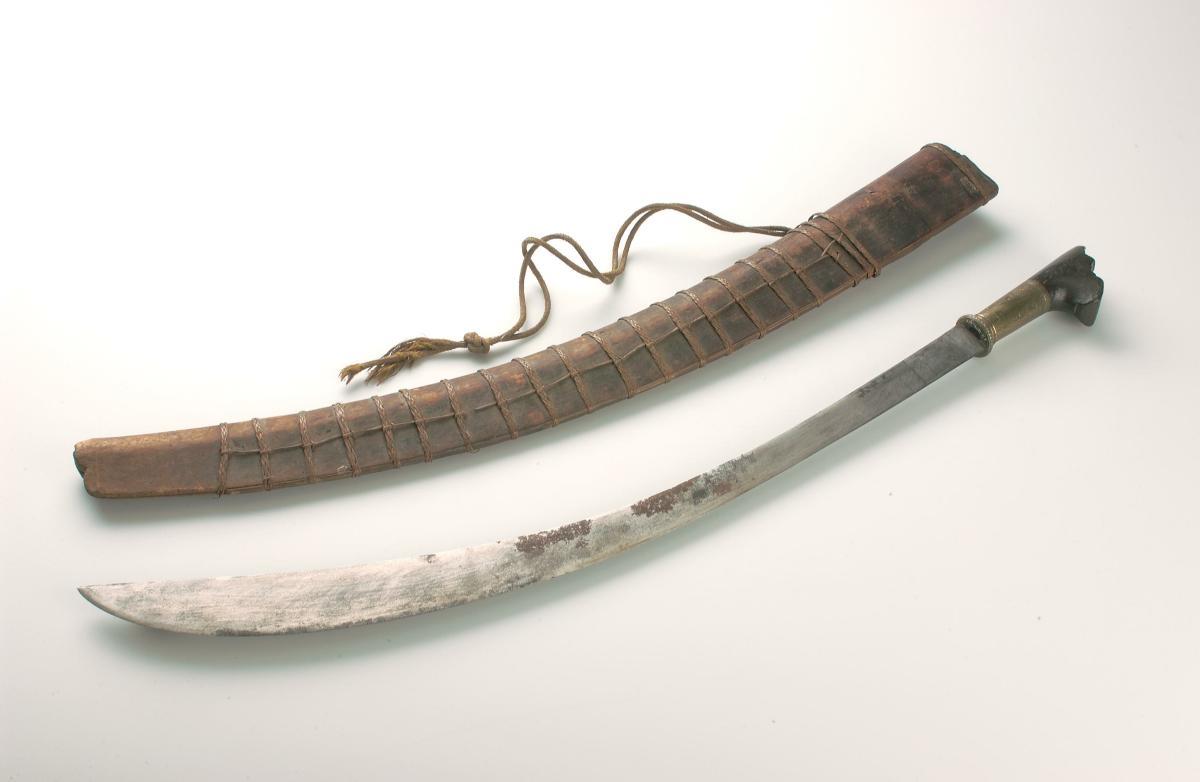 The blade of this 'kabeala', sword or machete, broadens slightly towards the tip. Its back curves towards the edge at the tip. It has an ivory hilt.The 'kabeala ' is the national sword of the people of east Sumba island. It would have been worn by all men within the community and used as a general purpose machete and knife as well as a weapon in warfare.