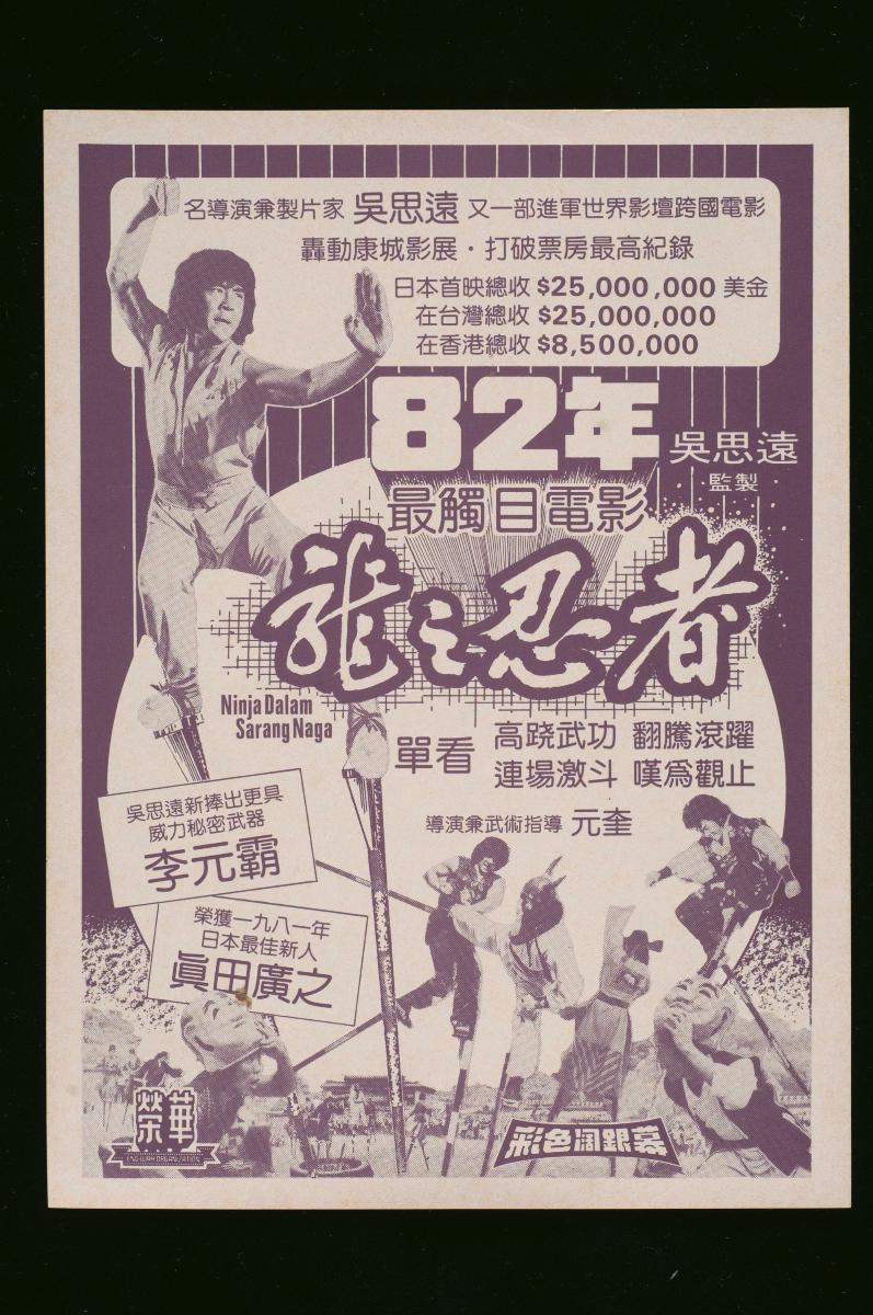 This handbill was used to advertise the Cantonese movie, ‘White Gold Dragon (Remake)’ (新白金龙, Xinbaijinglong), which was based on a Chinese opera. During its Singapore run, the movie was screened at the Oriental (东方, Dongfang) and Grand (大光, Daguang) cinemas.Between the 1950s and 1960s, most Mandarin, Cantonese and other Chinese-dialect movies were made in Hong Kong by film production companies with financial support from Singapore-based film studios such as Shaw Brothers, Cathay and Kong Ngee (光艺, Guanyi). These studios were also involved in the distribution and exhibition of these movies in Singapore and the rest of Southeast Asia through their network of cinemas. In the early 1970s, Mandarin movies from Taiwan became popular, but by the late 1970s, Hong Kong movies were dominant once more.