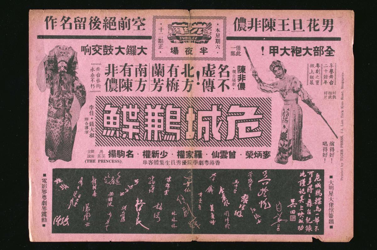 This handbill was used to advertise the Cantonese movie, ‘The Dangerous Seventeen’ (危险十七岁, Weixianshiqisui). During its Singapore run, the movie was screened at the Jubilee (光华, Guanghua) cinema.Between the 1950s and 1960s, most Mandarin, Cantonese and other Chinese-dialect movies were made in Hong Kong by film production companies with financial support from Singapore-based film studios such as Shaw Brothers, Cathay and Kong Ngee (光艺, Guanyi). These studios were also involved in the distribution and exhibition of these movies in Singapore and the rest of Southeast Asia through their network of cinemas. In the early 1970s, Mandarin movies from Taiwan became popular, but by the late 1970s, Hong Kong movies were dominant once more.
