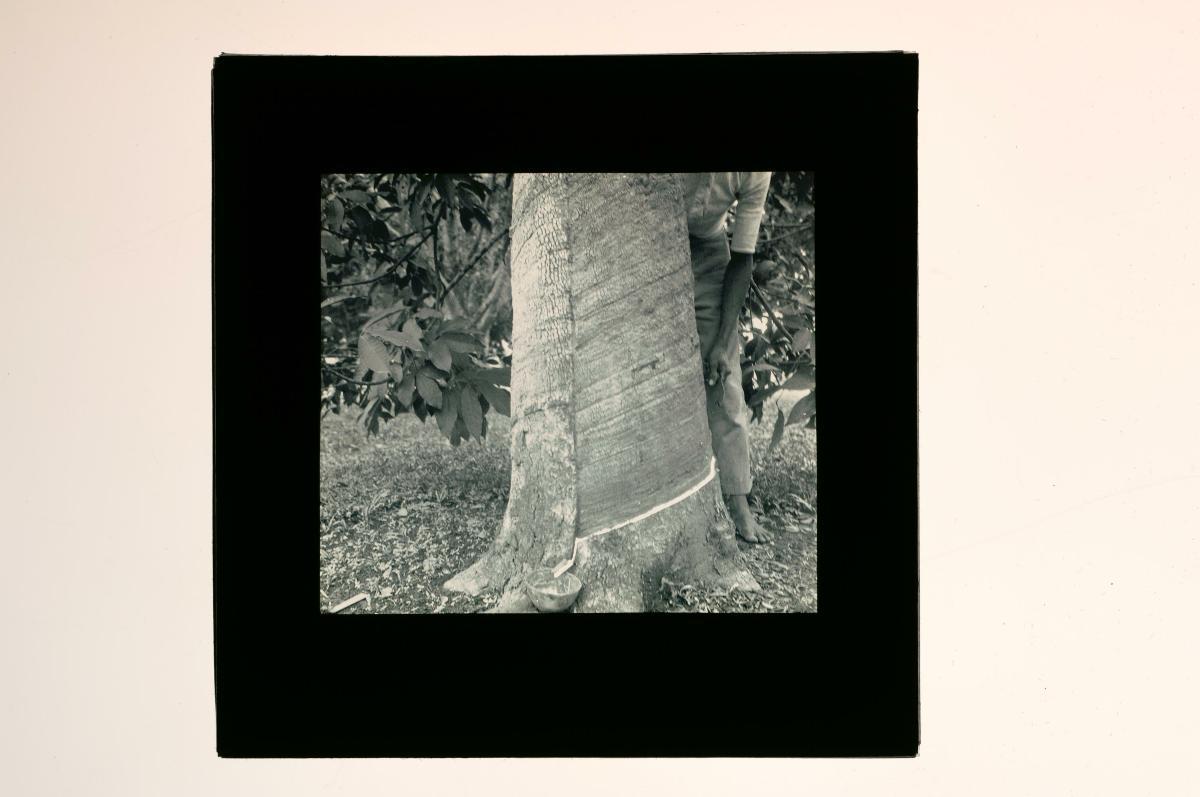 This photograph of latex being tapped from a rubber tree comes from the album of an RAF pilot who served in Singapore, Ceylon and the Pacific between 1938 and 1939.Most of the RAF pilots who served in Singapore during the 1930s were stationed at Seletar Airbase in the northeastern part of the island. Built on a 600-acre site formerly belonging to Singapore United Rubber Plantations, the airbase was operational by 1928 and officially became an RAF station in 1930. The airbase also served as a civilian airport until 1937, when the Kallang Airport was opened to handle commercial flights. Seletar Airbase was designed to handle both conventional aircraft as well as seaplanes such as the Short Singapore III and Short Sunderland flying boats. The first batch of Singapore IIIs departed from Pembroke Dock in the United Kingdom for Seletar in January 1935 to re-equip Number 205 Squadron. The first of the new Sunderlands arrived in Seletar from Pembroke Dock in June 1938 for use by Number 230 Squadron.