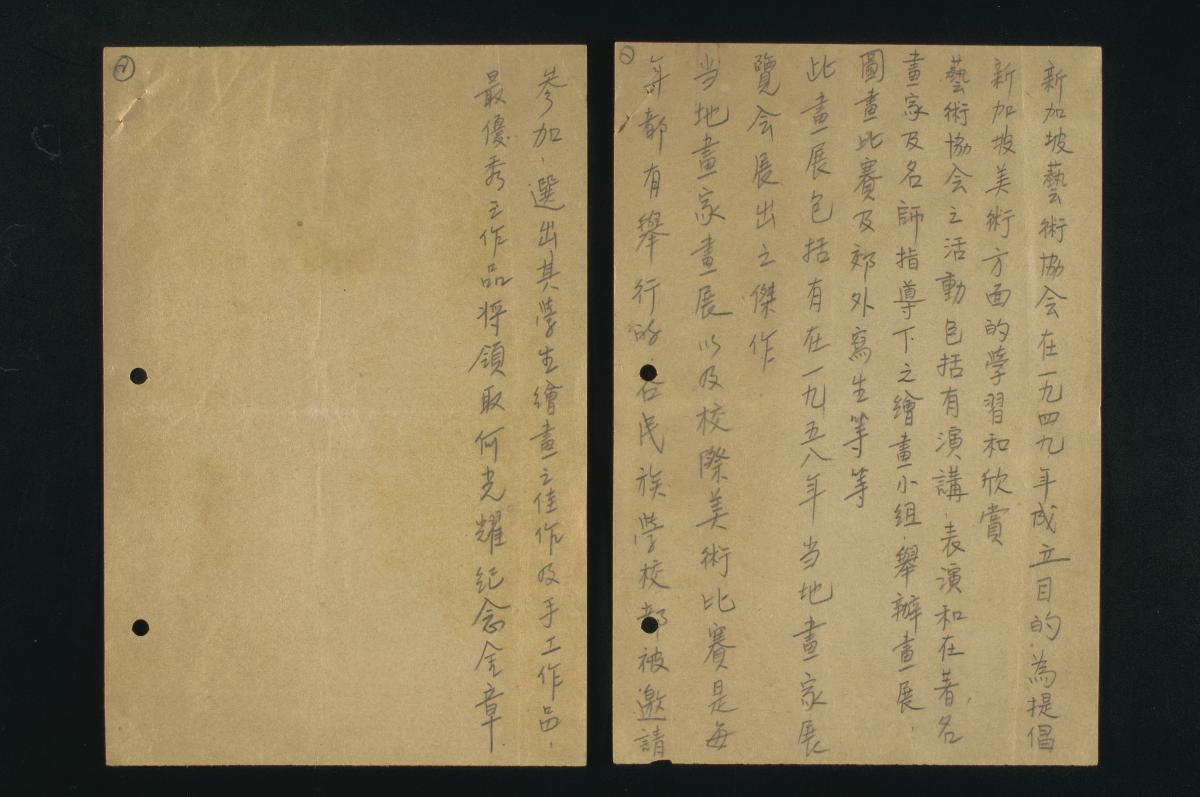 This draft transcript, written in Chinese, was for a speech to be given at a Singapore Art Society cultural event.The artefact most probably belonged to Ho Kok Hoe, a local architect and artist who learned to paint from his father Ho Kwong Yew, who was also an architect and artist, and his grandfather, who was a calligrapher. The younger Ho was a prominent architect who, while working for the family’s architectural firm Ho Kwong Yew & Sons, was responsible for designing Malaysia’s Muzium Negara (National Museum) in the 1960s. He was also actively involved in the local arts scene, especially during his two stints (1954–1967 and 1981–1983) as president of the Singapore Art Society. The Society was founded in October 1949 to help spread the practice and appreciation of art, improve the quality of local art, promote art exchanges with other countries and create opportunities for artists to learn and exhibit their works. The founding members of the society were, namely: Richard Walker (Art Superintendent); Charles Sulisbury (British Council); C. A. Gibson-Hill (Raffles Library and Museum); Francis Thomas (Chairman, Inter-School Art Exhibition Committee); Liu Kang (President, Society of Chinese Artists); Professor Roy Morell (University of Malaya); Mrs. Phillis Mackenzie; Suri bin Mohyani; and Tan Khoon Seng.