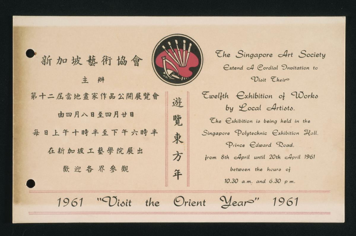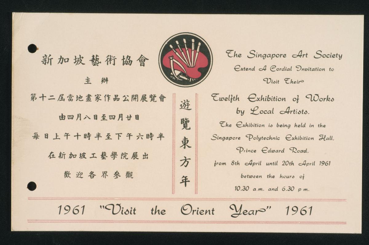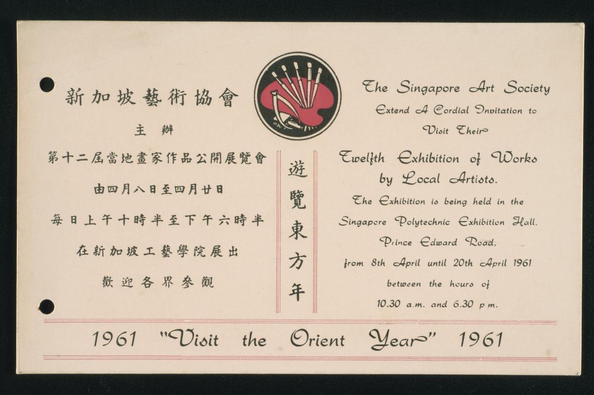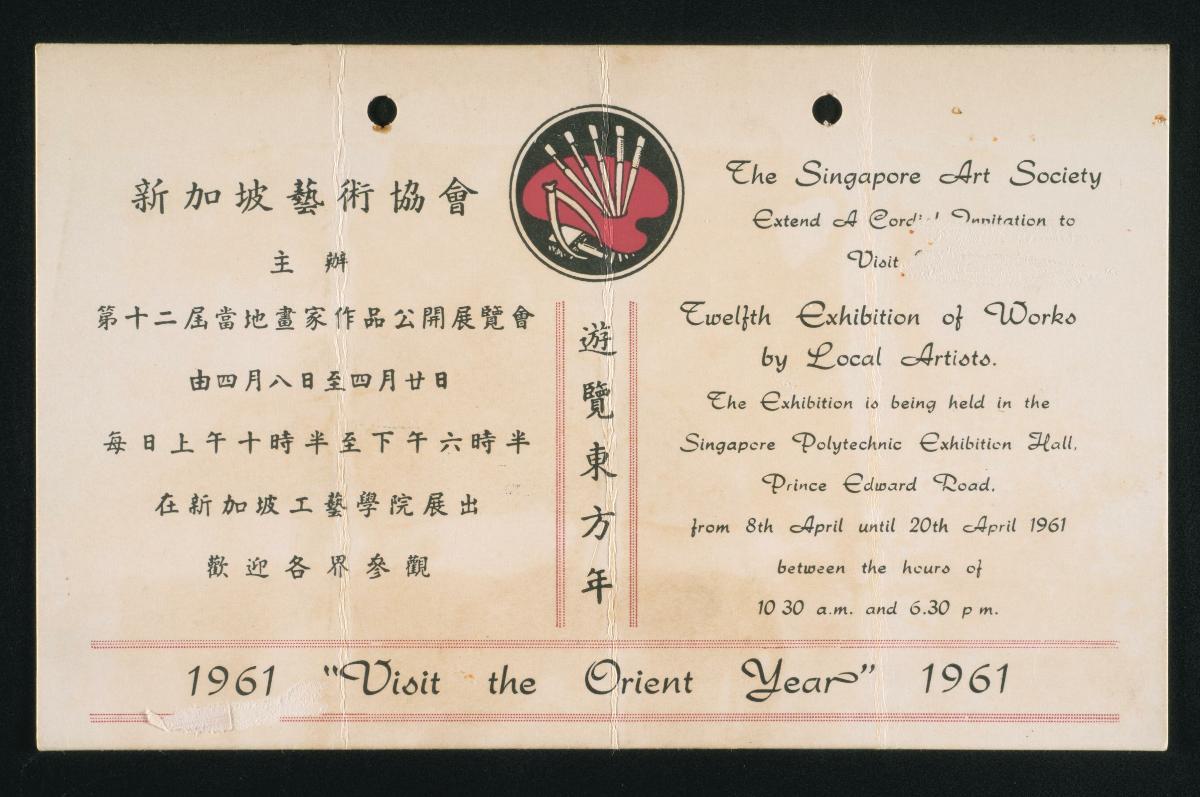 This invitation card was to the opening of the Third Annual Art Exhibition held at the Victoria Memorial Hall.The artefact most probably belonged to Ho Kok Hoe, a local architect and artist who learned to paint from his father Ho Kwong Yew, who was also an architect and artist, and his grandfather, who was a calligrapher. The younger Ho was a prominent architect who, while working for the family’s architectural firm Ho Kwong Yew & Sons, was responsible for designing Malaysia’s Muzium Negara (National Museum) in the 1960s. He was also actively involved in the local arts scene, especially during his two stints (1954–1967 and 1981–1983) as president of the Singapore Art Society. The Society was founded in October 1949 to help spread the practice and appreciation of art, improve the quality of local art, promote art exchanges with other countries and create opportunities for artists to learn and exhibit their works. The founding members of the society were, namely: Richard Walker (Art Superintendent); Charles Sulisbury (British Council); C. A. Gibson-Hill (Raffles Library and Museum); Francis Thomas (Chairman, Inter-School Art Exhibition Committee); Liu Kang (President, Society of Chinese Artists); Professor Roy Morell (University of Malaya); Mrs. Phillis Mackenzie; Suri bin Mohyani; and Tan Khoon Seng.