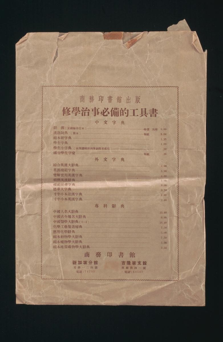 Between the 1950s and 1980s, carrier bags were either made of plastic or paper, although the latter was the favoured material up to the 1980s. The main types of paper used in paper bag making were imported kraft paper and wrapping paper. Rectangular pieces of cardboard were glued to the base and handles to make the bag sturdier. The final step was to tie the red and white cotton twine, which was imported from China, to the bag or to cut out the handles from the bag. Most carrier bags were aesthetically appealing and informative. The space on the bag was transformed into visually captivating advertisements to promote products and services. When carried around, the bag became ‘walking’ advertisements.