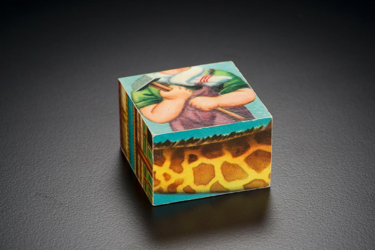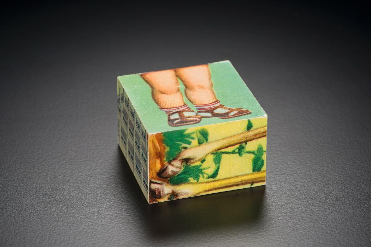 This is a simple toy that exercises children's creativity by letting them stack cubes, each with different faces, torsos or legs (accession nos. 2007-51085 to 2007-51096), to form different characters. This toy belongs to a series of objects (accession nos. 2007-50972 to 51483) that document the lifestyle and consumption of a typical Chinese upper middle-class family in the mid 20th century.