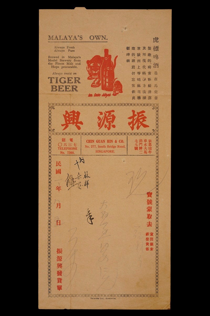 This photograph of a billboard advertising Tiger Beer in Chinese comes from the album of an RAF pilot who served in Singapore, Ceylon and the Pacific between 1938 and 1939.Most of the RAF pilots who served in Singapore during the 1930s were stationed at Seletar Airbase in the northeastern part of the island. Built on a 600-acre site formerly belonging to Singapore United Rubber Plantations, the airbase was operational by 1928 and officially became an RAF station in 1930. The airbase also served as a civilian airport until 1937, when the Kallang Airport was opened to handle commercial flights. Seletar Airbase was designed to handle both conventional aircraft as well as seaplanes such as the Short Singapore III and Short Sunderland flying boats. The first batch of Singapore IIIs departed from Pembroke Dock in the United Kingdom for Seletar in January 1935 to re-equip Number 205 Squadron. The first of the new Sunderlands arrived in Seletar from Pembroke Dock in June 1938 for use by Number 230 Squadron.