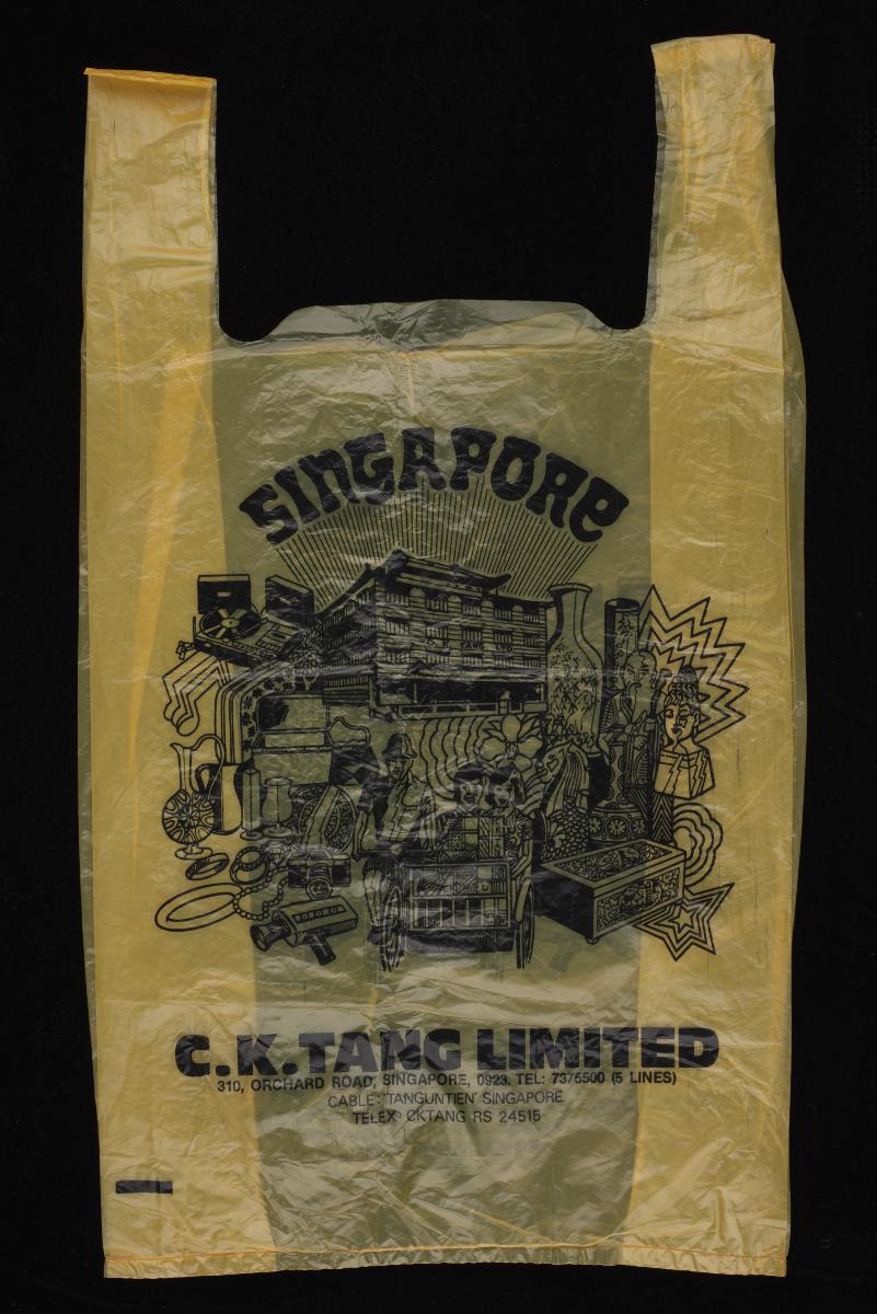 CK Tang Pte Ltd was located at 310 Orchard Road.Between the 1950s and 1980s, carrier bags were either made of paper or plastic, although the former was the favoured material up to the 1980s. Such bags without any handles were used to hold smaller items. The top was folded down and taped to prevent the contents from falling out.