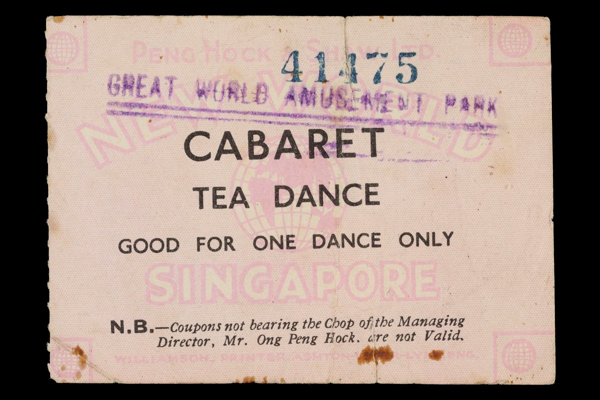 This pair of entrance tickets was to the New World Amusement Park.The artefacts most probably belonged to Ho Kok Hoe, a local architect and artist who learned to paint from his father Ho Kwong Yew, who was also an architect and artist, and his grandfather, who was a calligrapher. The younger Ho was a prominent architect who, while working for the family’s architectural firm Ho Kwong Yew & Sons, was responsible for designing Malaysia’s Muzium Negara (National Museum) in the 1960s. He was also actively involved in the local arts scene, especially during his two stints (1954–1967 and 1981–1983) as president of the Singapore Art Society. The Society was founded in October 1949 to help spread the practice and appreciation of art, improve the quality of local art, promote art exchanges with other countries and create opportunities for artists to learn and exhibit their works. The founding members of the society were, namely: Richard Walker (Art Superintendent); Charles Sulisbury (British Council); C. A. Gibson-Hill (Raffles Library and Museum); Francis Thomas (Chairman, Inter-School Art Exhibition Committee); Liu Kang (President, Society of Chinese Artists); Professor Roy Morell (University of Malaya); Mrs. Phillis Mackenzie; Suri bin Mohyani; and Tan Khoon Seng.