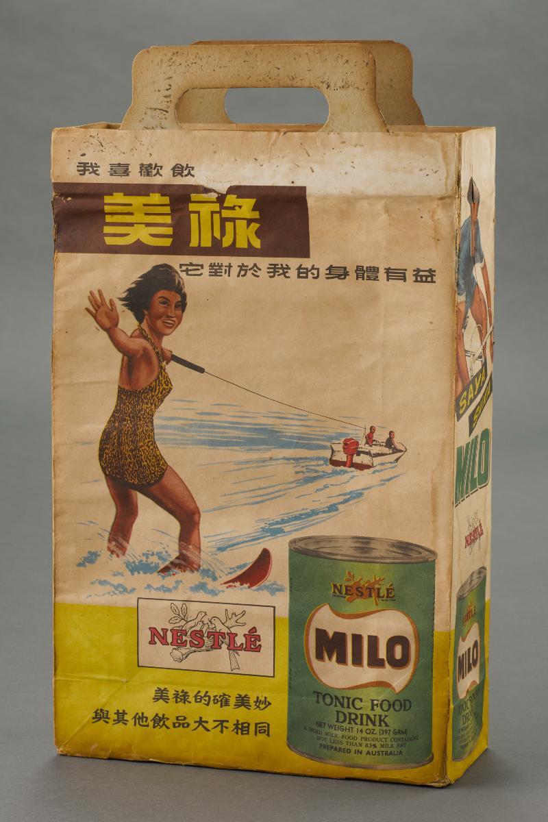 Between the 1950s and 1980s, carrier bags were either made of plastic or paper, although the latter was the favoured material up to the 1980s. The main types of paper used in paper bag making were imported kraft paper and wrapping paper. Rectangular pieces of cardboard were glued to the base and handles to make the bag sturdier. The final step was to tie the red and white cotton twine, which was imported from China, to the bag or to cut out the handles from the bag. Most carrier bags were aesthetically appealing and informative. The space on the bag was transformed into visually captivating advertisements to promote products and services. When carried around, the bag became ‘walking’ advertisements.