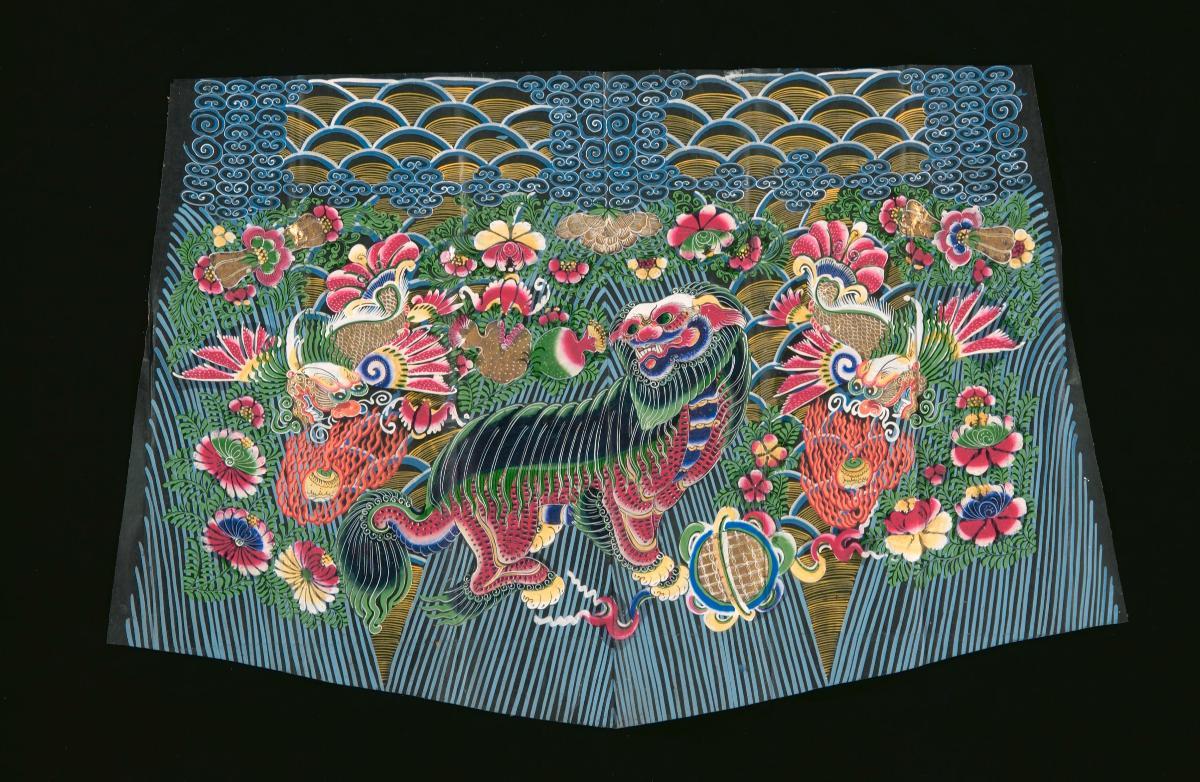 This paper cut-out with a dragon motif is used to form a paper robe. The robe is burnt as an offering to a male deity. Burnt offerings are integral to Taoist worship and rituals. Offerings are burnt as gifts during temple festivals to commemorate the birthdays of gods and deities. At Taoist funerals, burnt offerings are made to ensure that the deceased enjoys a comfortable life in the netherworld. The articles burnt as offerings are made from paper and are often imitations of real objects. They can be purchased from shops dedicated to selling these religious paraphernalia, which are referred to locally as “paper shops”. These shops sell a wide range of items, from elaborately decorated paper houses, cars and furniture, to bank notes and garments. The paper garments are usually life-size. They follow closely the iconographic conventions of opera costumes. Chinese operas are performed as entertainment for the gods as part of Taoist religious festivities.