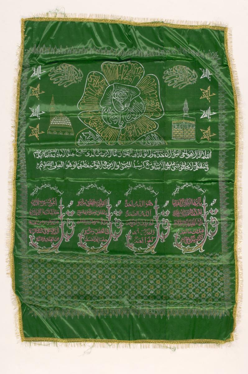 This red textile with yellow patterns was bought by the donor in Pakistan.