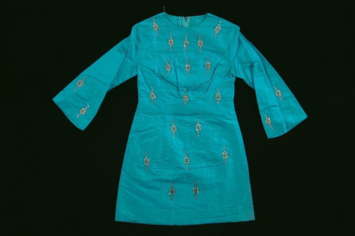This mini dress belonged to the donor's mother, who was an air stewardess in the 1950s and 1960s. Mini dresses and skirts first appeared in the 1960s and were influenced by youth fashion.