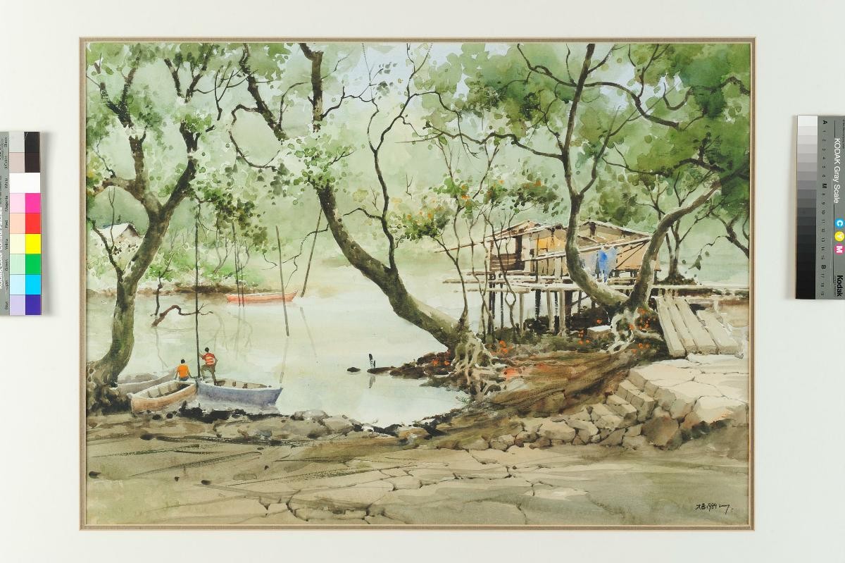 Cheong Soo Pieng was born in Amoy, China in 1917. He studied at the Amoy Art Academy and the Xinhua Academy of Fine Arts in Shanghai from 1933 to 1936. In 1946, Cheong settled in Singapore and taught at the Nanyang Academy of Fine Arts until 1961. Together with fellow artists Chen Wen Hsi, Chen Chong Swee and Liu Kang, they went to Bali, Indonesia in 1952 in search of new inspiration and subject matter. Cheong had a dominant influence on the development of modern art in Singapore and is regarded as one of Singapore’s pioneer artists. His innovative experimentations towards developing his stylistic oeuvre had a great influence on his students, many of whom later became established artists in the region. For his contributions in art, he was awarded the Meritorious Service Medal by the Singapore government in 1962. Cheong passed away in 1983 in Singapore.Cheong was greatly intrigued and inspired by the artworks he saw during his trip to Europe in the early 1960s. Rendered in fluid, broad strokes and coupled with the rich use of strong rich colours, ‘Village Scene’ presents an interesting abstraction of a local village scene with a dynamic interplay of colour and light. The clearly-defined line work, depicted in prominent black, conveys depth to the entire work. The stylization of the village houses, trees and surroundings are evocative of local flavours given a modern interpretation.