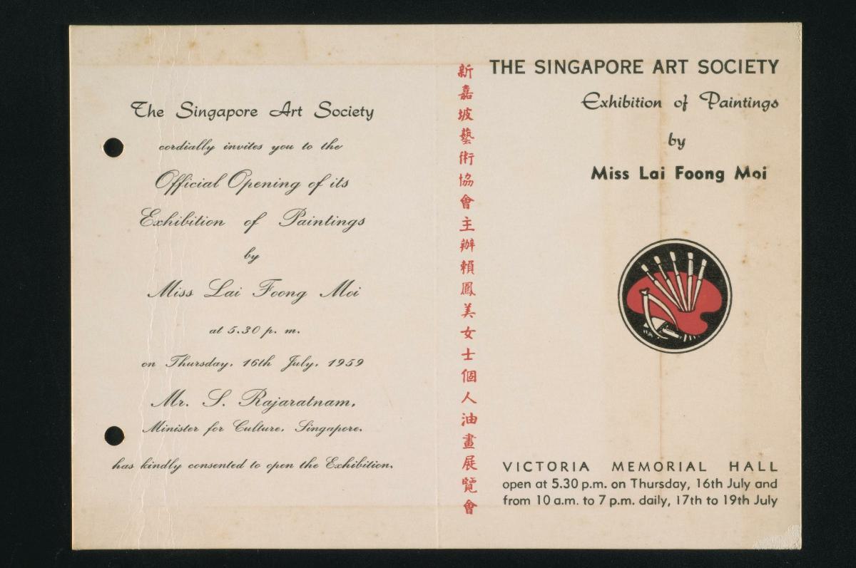 This invitation card was addressed to Ho Kok Hoe, President of the Singapore Art Society. It was an invitation to an exhibition of paintings by Thomas Yeo, entitled ‘The New Image’.The artefact most probably belonged to Ho Kok Hoe, a local architect and artist who learned to paint from his father Ho Kwong Yew, who was also an architect and artist, and his grandfather, who was a calligrapher. The younger Ho was a prominent architect who, while working for the family’s architectural firm Ho Kwong Yew & Sons, was responsible for designing Malaysia’s Muzium Negara (National Museum) in the 1960s. He was also actively involved in the local arts scene, especially during his two stints (1954–1967 and 1981–1983) as president of the Singapore Art Society. The Society was founded in October 1949 to help spread the practice and appreciation of art, improve the quality of local art, promote art exchanges with other countries and create opportunities for artists to learn and exhibit their works. The founding members of the society were, namely: Richard Walker (Art Superintendent); Charles Sulisbury (British Council); C. A. Gibson-Hill (Raffles Library and Museum); Francis Thomas (Chairman, Inter-School Art Exhibition Committee); Liu Kang (President, Society of Chinese Artists); Professor Roy Morell (University of Malaya); Mrs. Phillis Mackenzie; Suri bin Mohyani; and Tan Khoon Seng.
