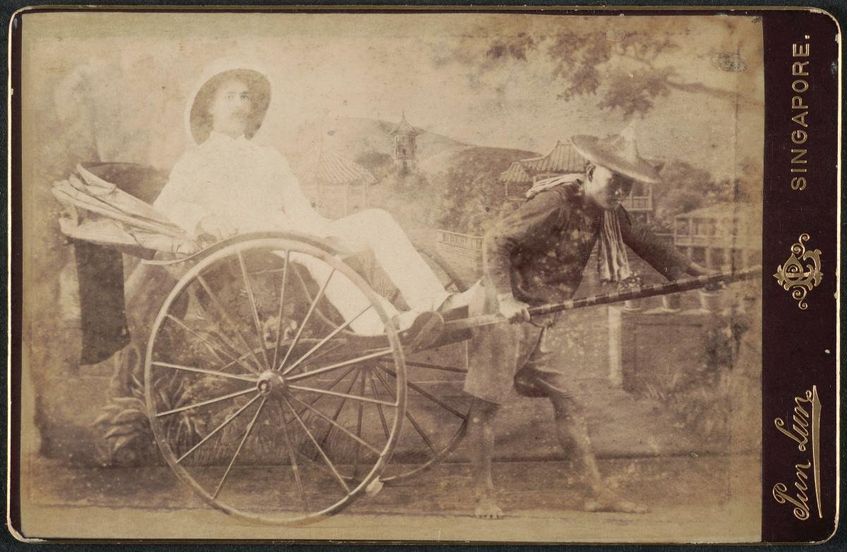 This is a photograph of a European couple riding in a rickshaw within a forest at Bukit Timah.