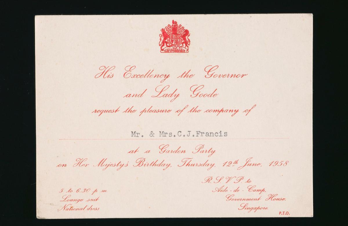 This is a set of invitation card and programme pamphlets for the Queen’s Birthday Parade held at the Padang on 12 June 1958. The set includes a programme pamphlet, car marker, seat ticket and invitation card.