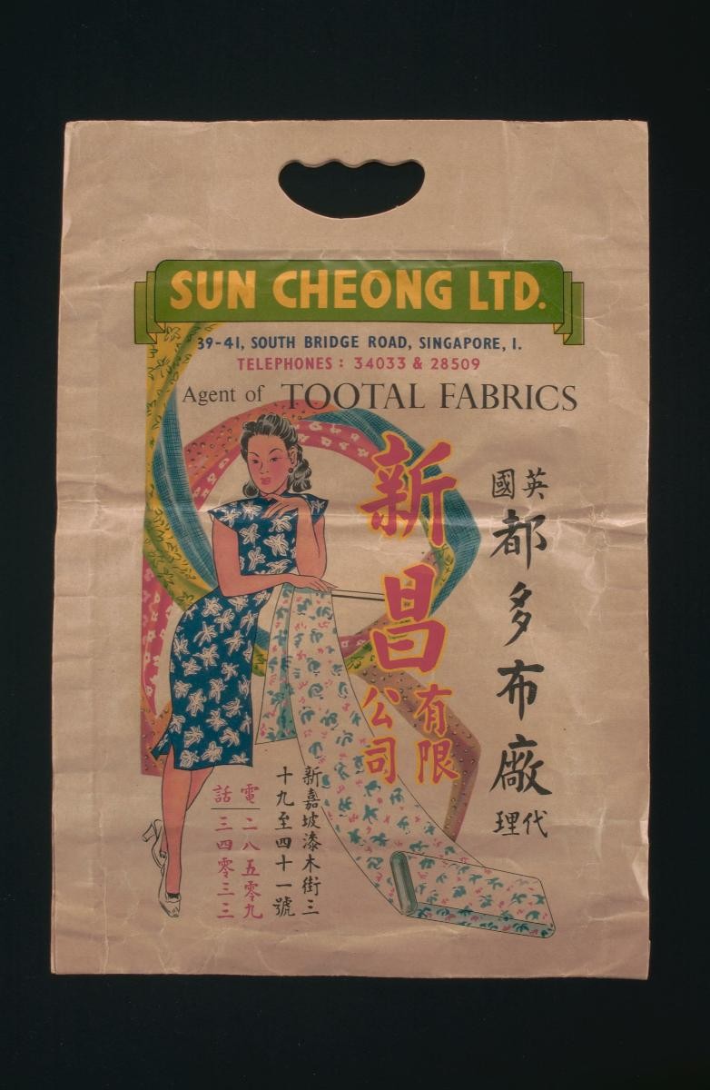 Heng Lee was located at 906 Upper Serangoon Road.Between the 1950s and 1980s, carrier bags were either made of plastic or paper, although the latter was the favoured material up to the 1980s. The main types of paper used in paper bag making were imported kraft paper and wrapping paper. Rectangular pieces of cardboard were glued to the base and handles to make the bag sturdier. The final step was to tie the red and white cotton twine, which was imported from China, to the bag or to cut out the handles from the bag. Most carrier bags were aesthetically appealing and informative. The space on the bag was transformed into visually captivating advertisements to promote products and services. When carried around, the bag became ‘walking’ advertisements.