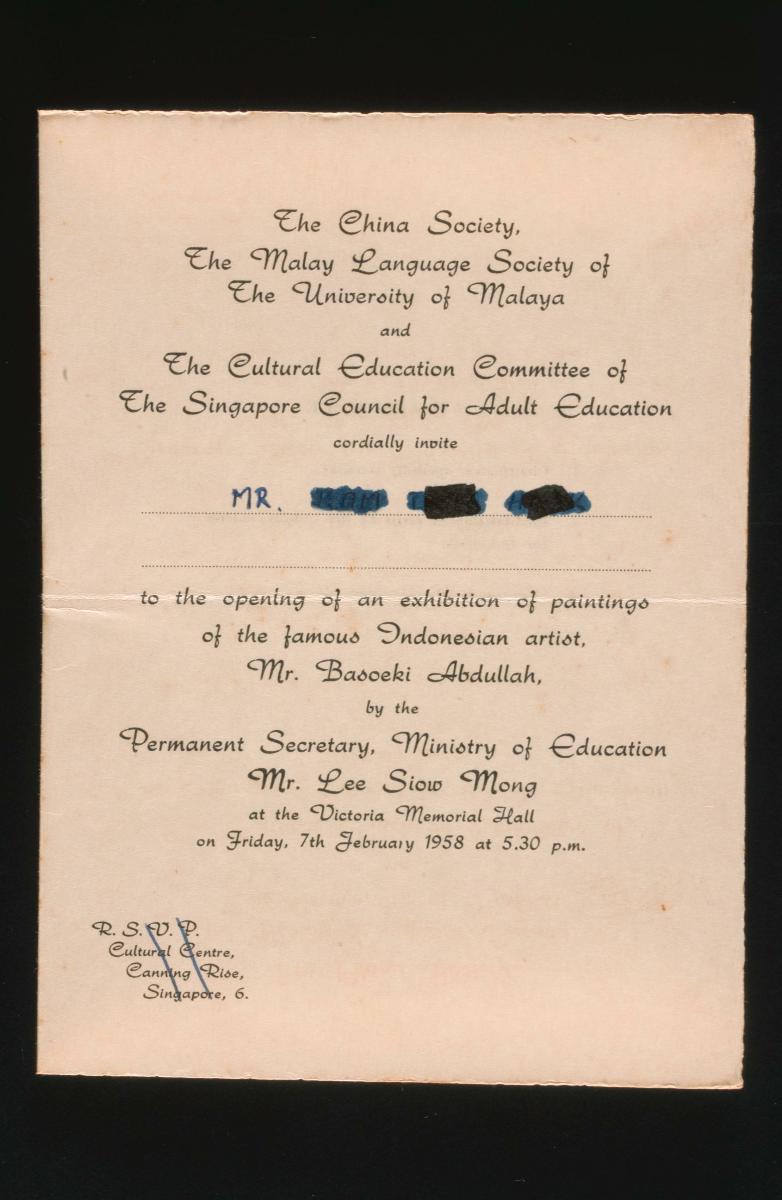 This invitation card, written in Chinese, was to a joint exhibition of paintings by two artists.The artefact most probably belonged to Ho Kok Hoe, a local architect and artist who learned to paint from his father Ho Kwong Yew, who was also an architect and artist, and his grandfather, who was a calligrapher. The younger Ho was a prominent architect who, while working for the family’s architectural firm Ho Kwong Yew & Sons, was responsible for designing Malaysia’s Muzium Negara (National Museum) in the 1960s. He was also actively involved in the local arts scene, especially during his two stints (1954–1967 and 1981–1983) as president of the Singapore Art Society. The Society was founded in October 1949 to help spread the practice and appreciation of art, improve the quality of local art, promote art exchanges with other countries and create opportunities for artists to learn and exhibit their works. The founding members of the society were, namely: Richard Walker (Art Superintendent); Charles Sulisbury (British Council); C. A. Gibson-Hill (Raffles Library and Museum); Francis Thomas (Chairman, Inter-School Art Exhibition Committee); Liu Kang (President, Society of Chinese Artists); Professor Roy Morell (University of Malaya); Mrs. Phillis Mackenzie; Suri bin Mohyani; and Tan Khoon Seng.