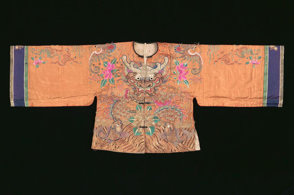 A red top with embroidered flower and dragon motifs worn by a ‘wu sheng’ in a Chinese opera