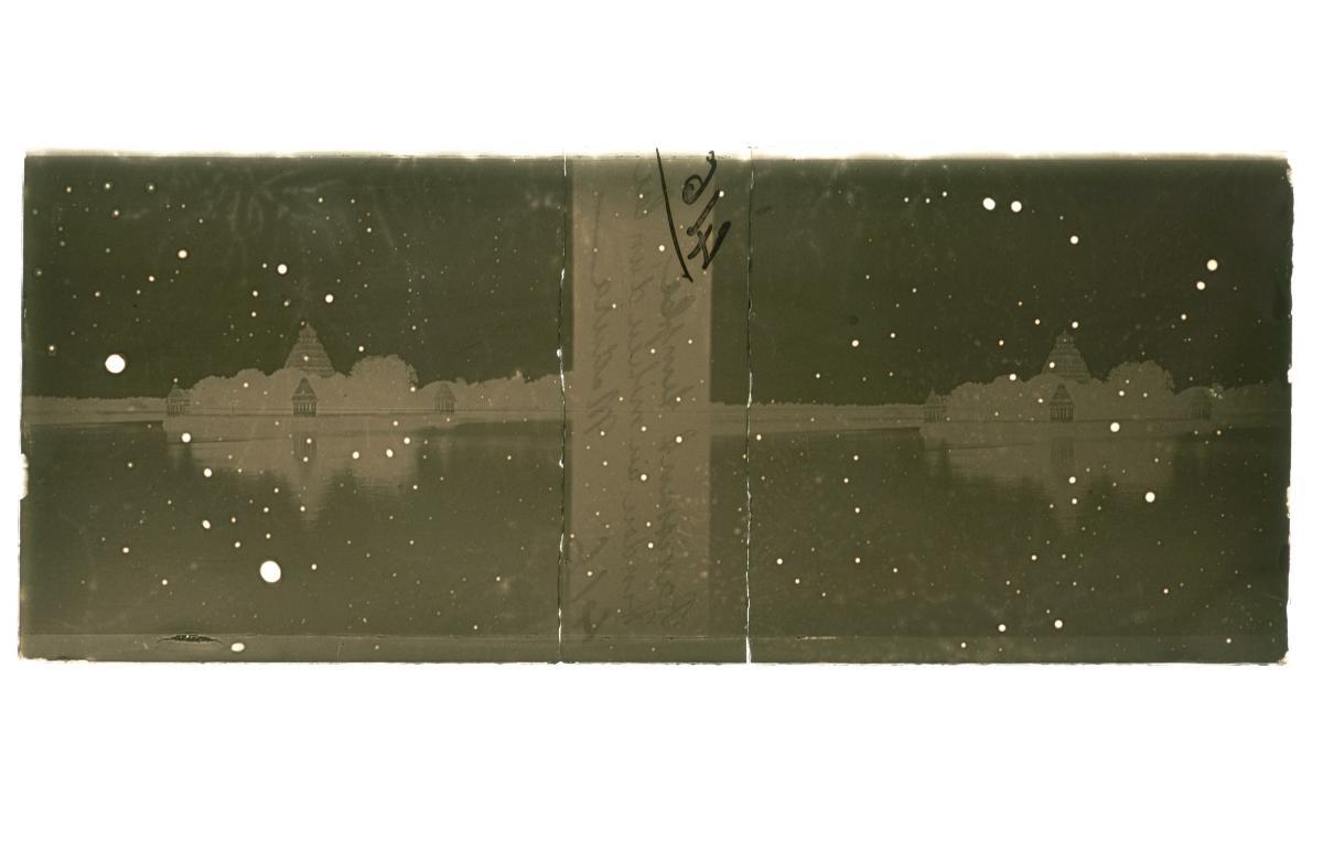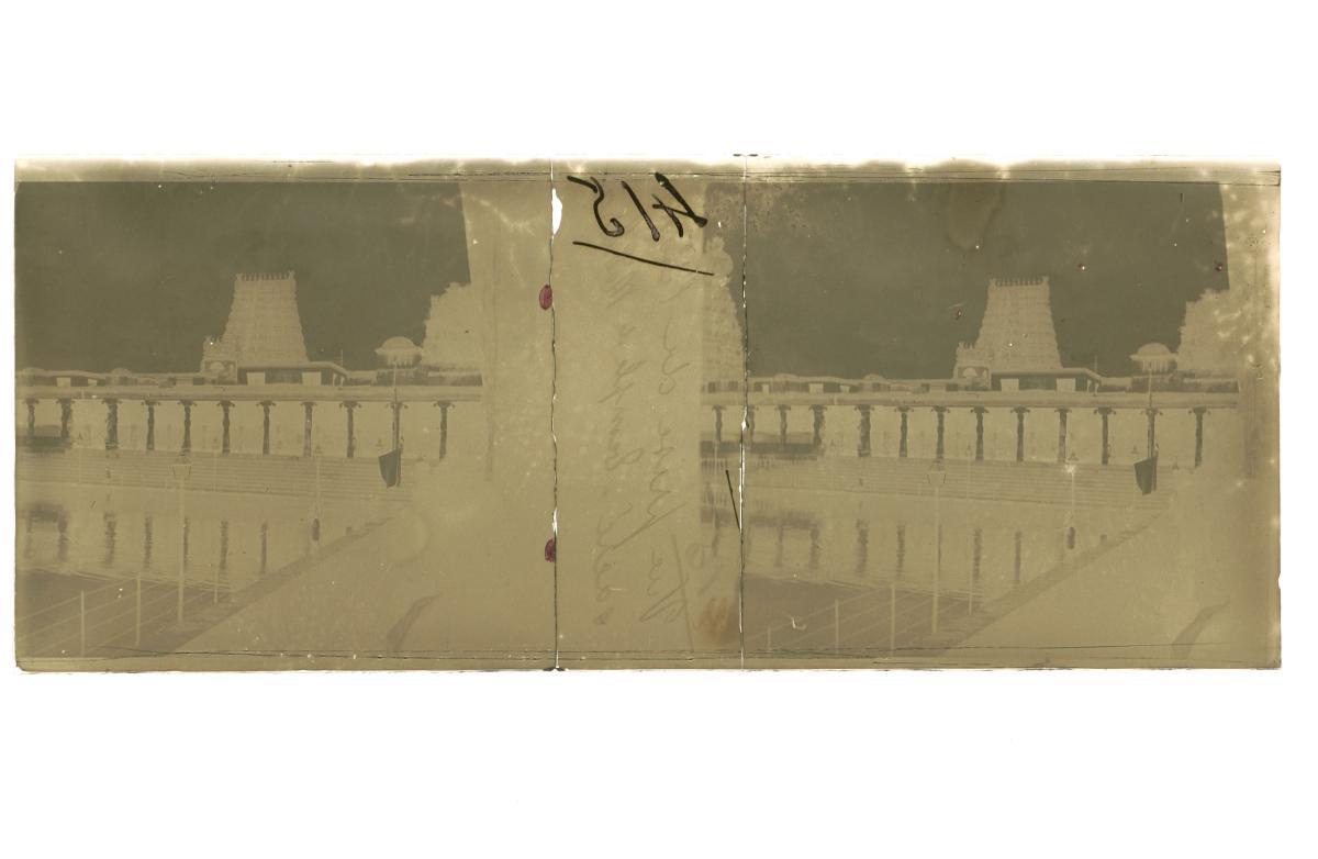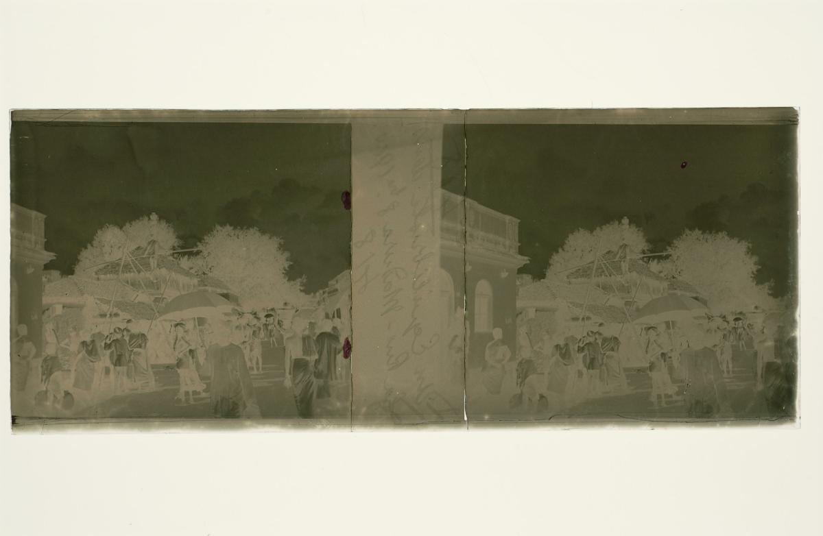 This is a glass stereoscopic slide from the H. Schaefer Collection showing a street scene taken either at Madurai, a temple town in India, or Madras, the capital city of the Indian state of Tamil Nadu.