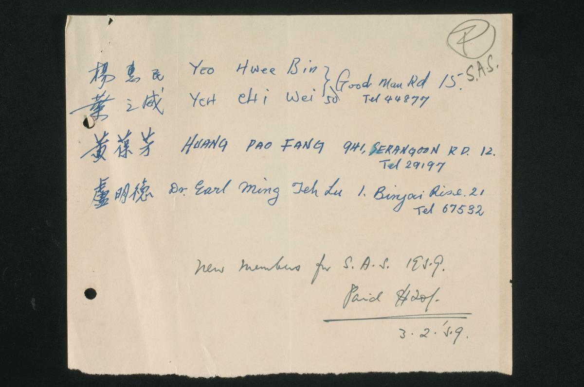 This statement of account was from the Singapore Art Society to Chop Eng Aun Tong, summarising payments due for advertisements placed in exhibition catalogues.The artefact most probably belonged to Ho Kok Hoe, a local architect and artist who learned to paint from his father Ho Kwong Yew, who was also an architect and artist, and his grandfather, who was a calligrapher. The younger Ho was a prominent architect who, while working for the family’s architectural firm Ho Kwong Yew & Sons, was responsible for designing Malaysia’s Muzium Negara (National Museum) in the 1960s. He was also actively involved in the local arts scene, especially during his two stints (1954–1967 and 1981–1983) as president of the Singapore Art Society. The Society was founded in October 1949 to help spread the practice and appreciation of art, improve the quality of local art, promote art exchanges with other countries and create opportunities for artists to learn and exhibit their works. The founding members of the society were, namely: Richard Walker (Art Superintendent); Charles Sulisbury (British Council); C. A. Gibson-Hill (Raffles Library and Museum); Francis Thomas (Chairman, Inter-School Art Exhibition Committee); Liu Kang (President, Society of Chinese Artists); Professor Roy Morell (University of Malaya); Mrs. Phillis Mackenzie; Suri bin Mohyani; and Tan Khoon Seng.