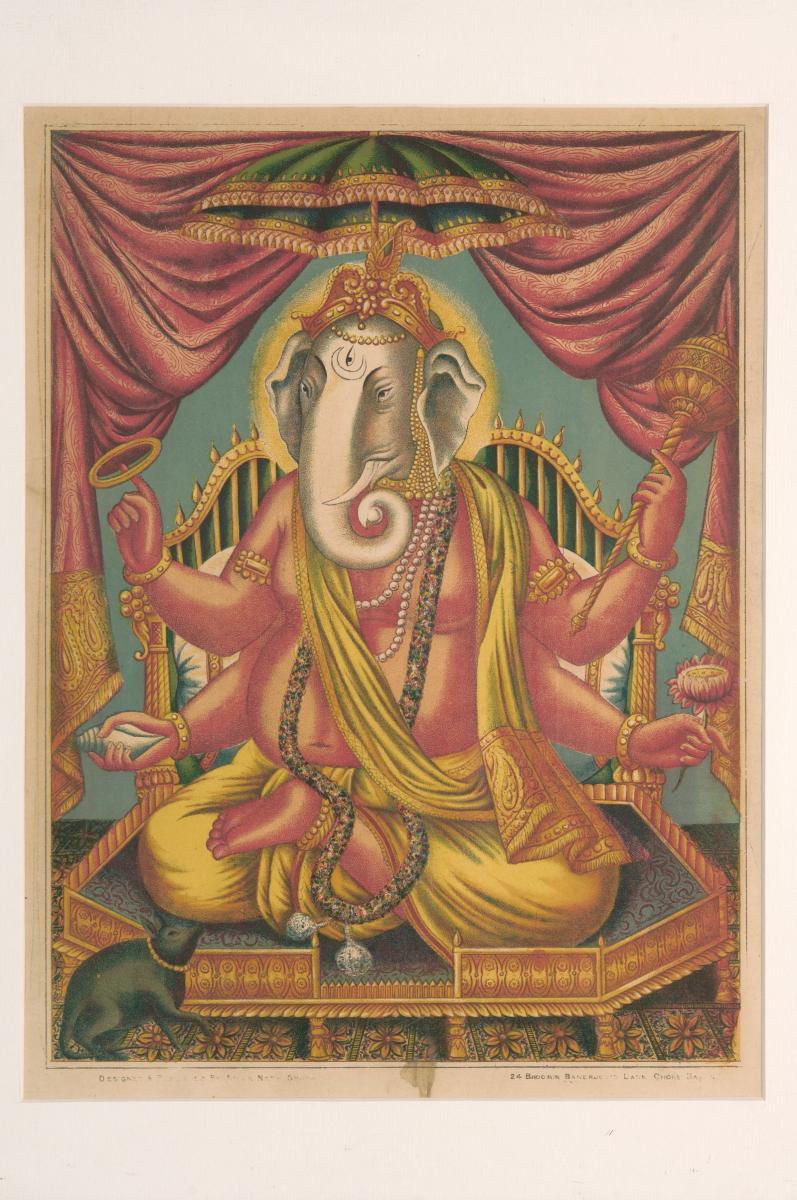 This is a chromolithograph printed in Calcutta of the Hindu deity Durga, who is often worshipped as the goddess of victory of good over evil.