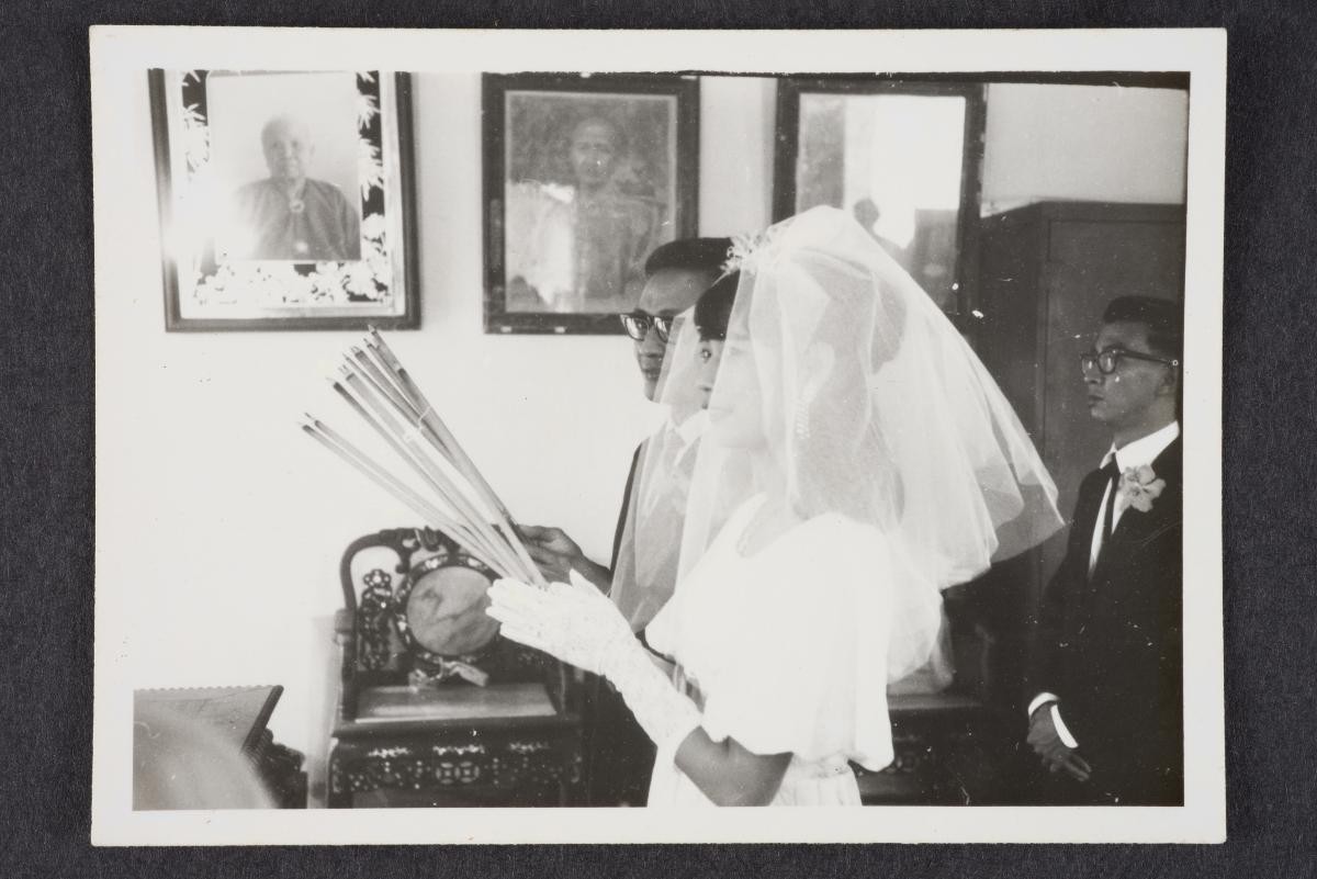 Negative photograph of a woman burning joss sticks and offering prayer by Lee Sow Lim