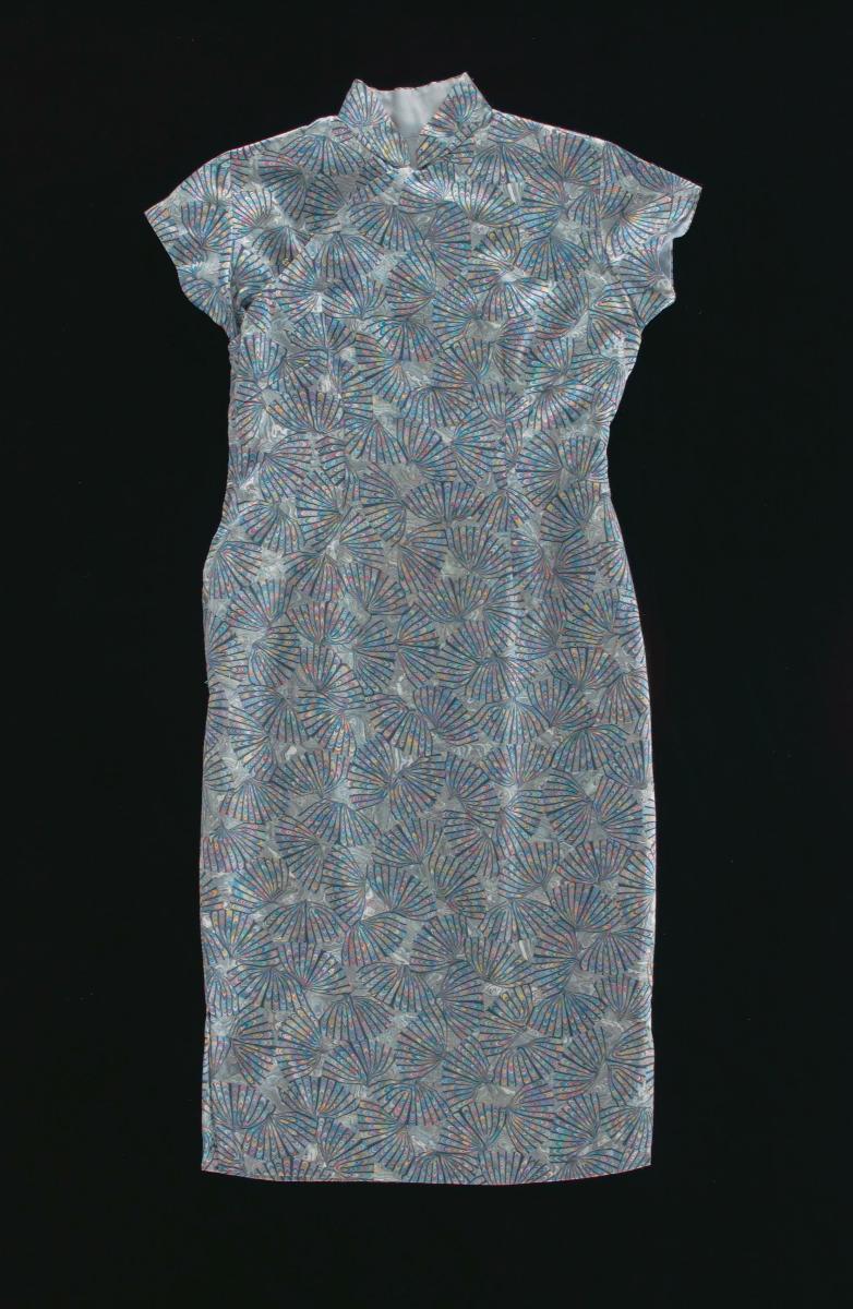 This is a light grey short-sleeve cheongsam with motifs of fans allover. It is figure hugging and tapered at the bottom, giving the wearer a pencil slim silhouette.This cheongsam belonged to Amy Ede nee Laycock, the adoptive daughter of John Laycock who was instrumental in founding the Singapore Progressive Party in 1947 and later the Liberal Socialist Party in 1956. Amy Ede nee Laycock was one of the earliest women in Singapore to join politics. She won a seat in the Municipal Council in the 1949 elections when she was 26 years old. She quit politics in the mid-1950s, and helped John Laycock to run his orchid garden in Mandai. She has 3 orchid hybrids Aerides Amy, Vanda Amy and Dendrobium Amy Ede named after her.