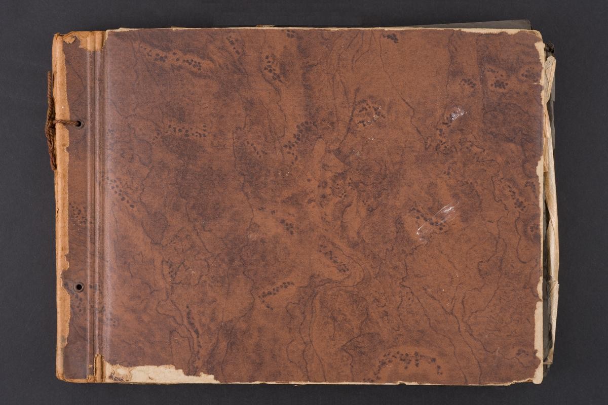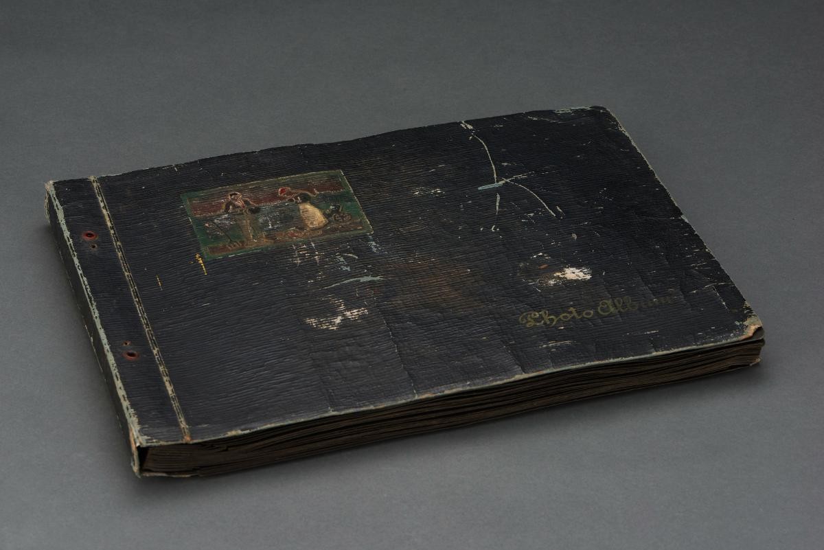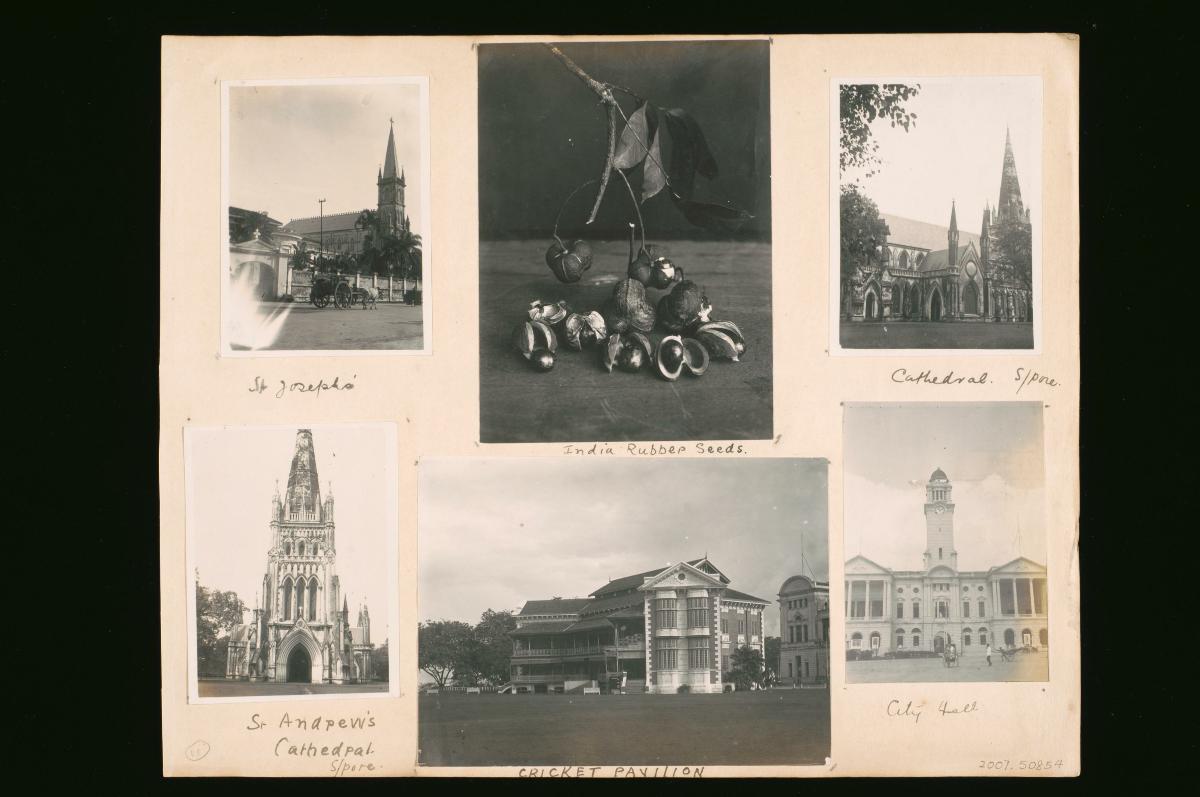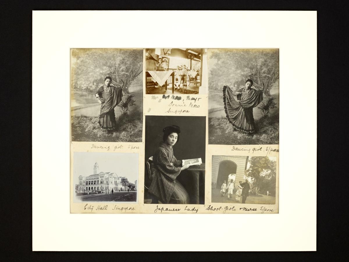 This is a page from an album that has photographs depicting the following (clockwise, from top left): a European girl dressed up in her mother’s clothes; a European house; Europeans playing tennis; Europeans swimming in the river; a Japanese official in uniform; and Malay men walking on the street.