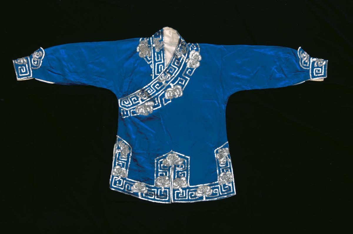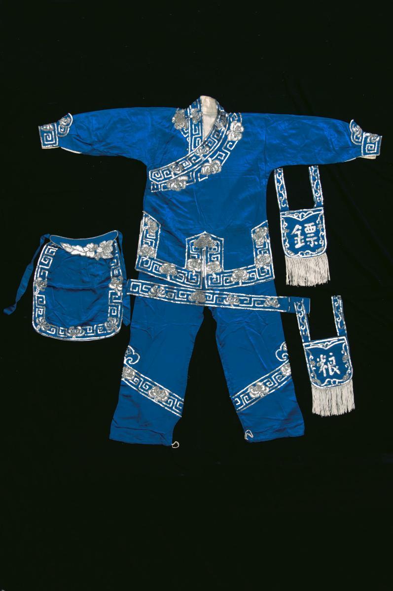 A pair of blue trousers with silver floral sequins worn by a ‘wu dan’ in a Chinese opera