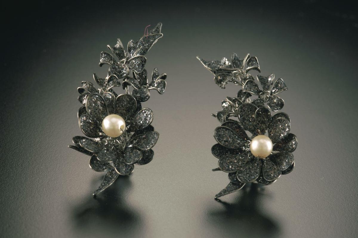 A pair of ear rings with pearls and crystals that belonged to a notable women's rights activist