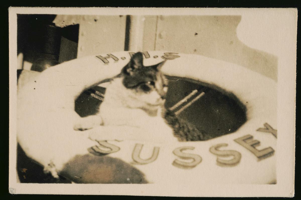 This photo shows a dog in a trumpet on board the HMS Sussex. It was probably kept as a pet by the crew.The HMS Sussex was a London class heavy cruiser of the British Royal Navy that entered into service in 1939, serving primarily in the Mediterranean and South Atlantic. It was hit by a bomb during a German air raid while docked at Glasgow, Scotland in 1940. The ship was severely damaged. Following the completion of repairs in late August 1942, the vessel was redeployed to Southeast Asian waters, where it became the flagship of the Eastern Fleet. It sailed to Singapore to assist in its liberation in 1945 where it became a firsthand witness to the Japanese surrender. General Seishito Itagaki signed instruments of surrender on board the vessel on 4 September 1945, after which an official surrender ceremony was held at the Municipal Building (now called City Hall) eight days later on 12 September. The ship was decommissioned in 1949 and broken up at the Dalmuir naval yard in 1950.