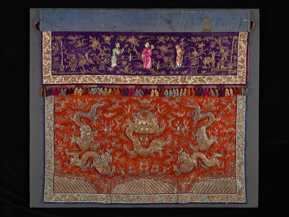 This altar features curved legs and a curved front design with carvings of the auspicious motifs of ‘fu lu shou’ and the cockerel. It is made of teak but lacquered red, a practice more common to gilded namwood Peranakan wedding furniture.