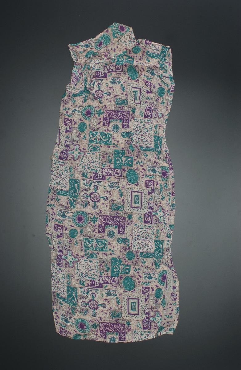This is a blue short-sleeve cheongsam with geometric patterns allover. The flap on the right hand side is secured by press studs while the zipper is on the side. This cheongsam belonged to Amy Ede nee Laycock, the adoptive daughter of John Laycock who was instrumental in founding the Singapore Progressive Party in 1947 and later the Liberal Socialist Party in 1956. Amy Ede nee Laycock was one of the earliest women in Singapore to join politics. She won a seat in the Municipal Council in the 1949 elections when she was 26 years old. She quit politics in the mid-1950s, and helped John Laycock to run his orchid garden in Mandai. She has 3 orchid hybrids Aerides Amy, Vanda Amy and Dendrobium Amy Ede named after her.