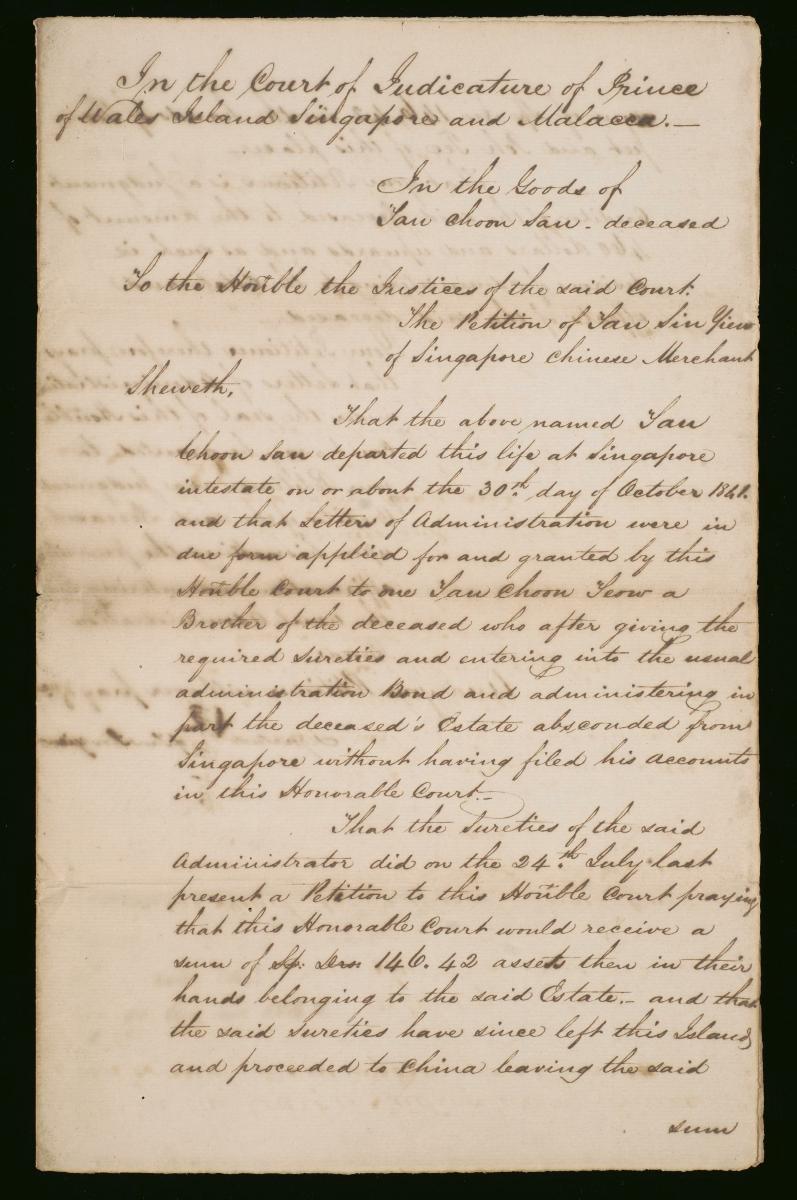 This is the petition of Ibram Saw and Hussain Saw of Singapore concerning the administration of the estate of Hassan Hussain Pillay. It is part of a collection of legal documents from the 19th and early 20th centuries which provides a glimpse into the work of the notable personalities who left their mark on Singapore’s legal history, and the economic and other transactions undertaken by ordinary immigrants in 19th century Singapore that tell stories of misfortune and indebtedness which would otherwise have disappeared from history.