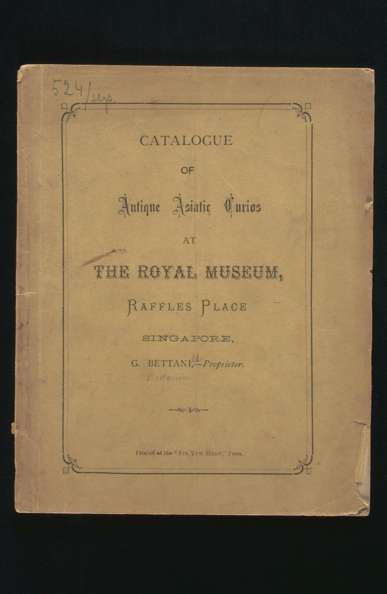 This is a postcard printed with an advertisement from ‘The Royal Museum’ at Raffles Place. The 'Royal Museum’ was a private antique business owned by an individual named G. Bettanin. The existence of Bettanin’s enterprise indicated that there was probably a growing demand for and trade in the anthropological materials of the region during the late 19th century. By styling his business after a ‘museum’, Bettanin was also likely to be tapping into the wave of anthropological interest generated by the opening of The Raffles Library and Museum at Stamford Road in 1887.